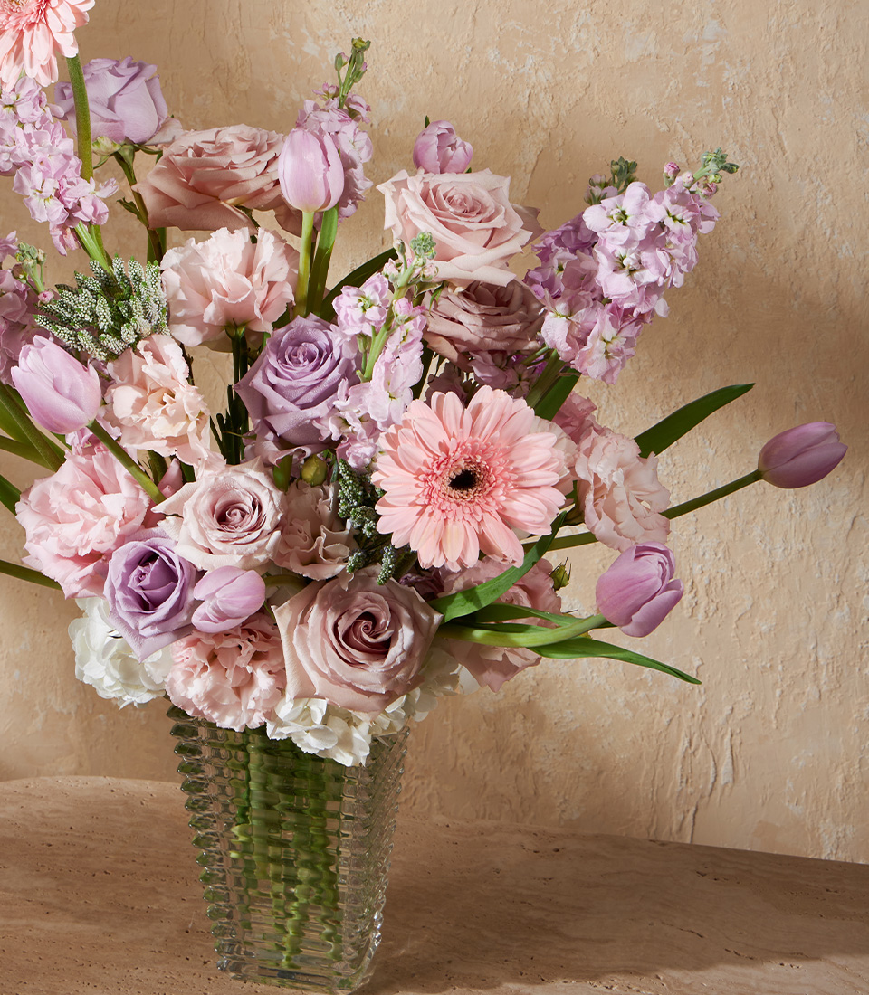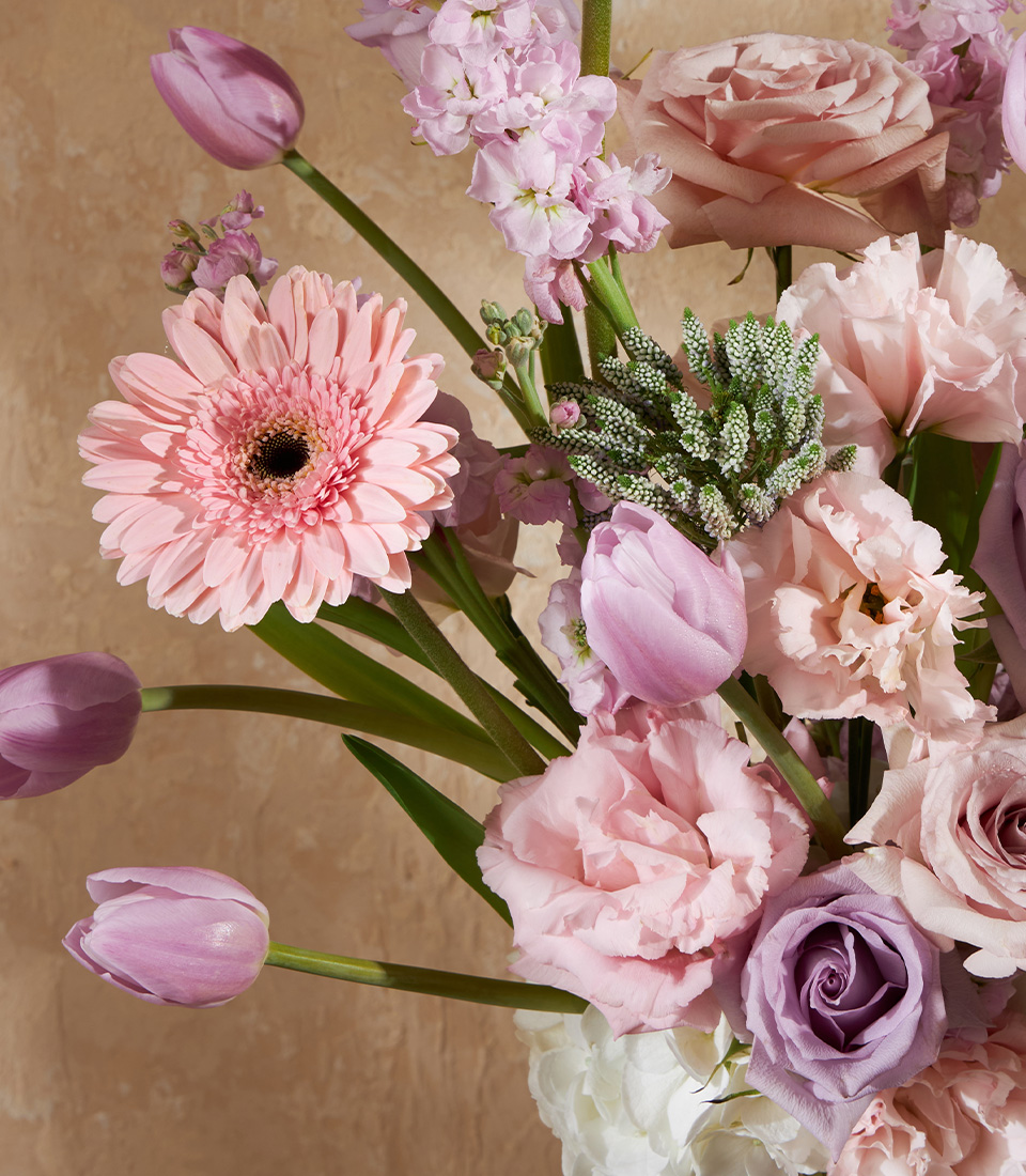 Lavender Peach Harmony Vase A sophisticated vase blending Ocean Song roses, Quicksand roses, tulips, and gerberas in lavender–peach tones for timeless elegance.