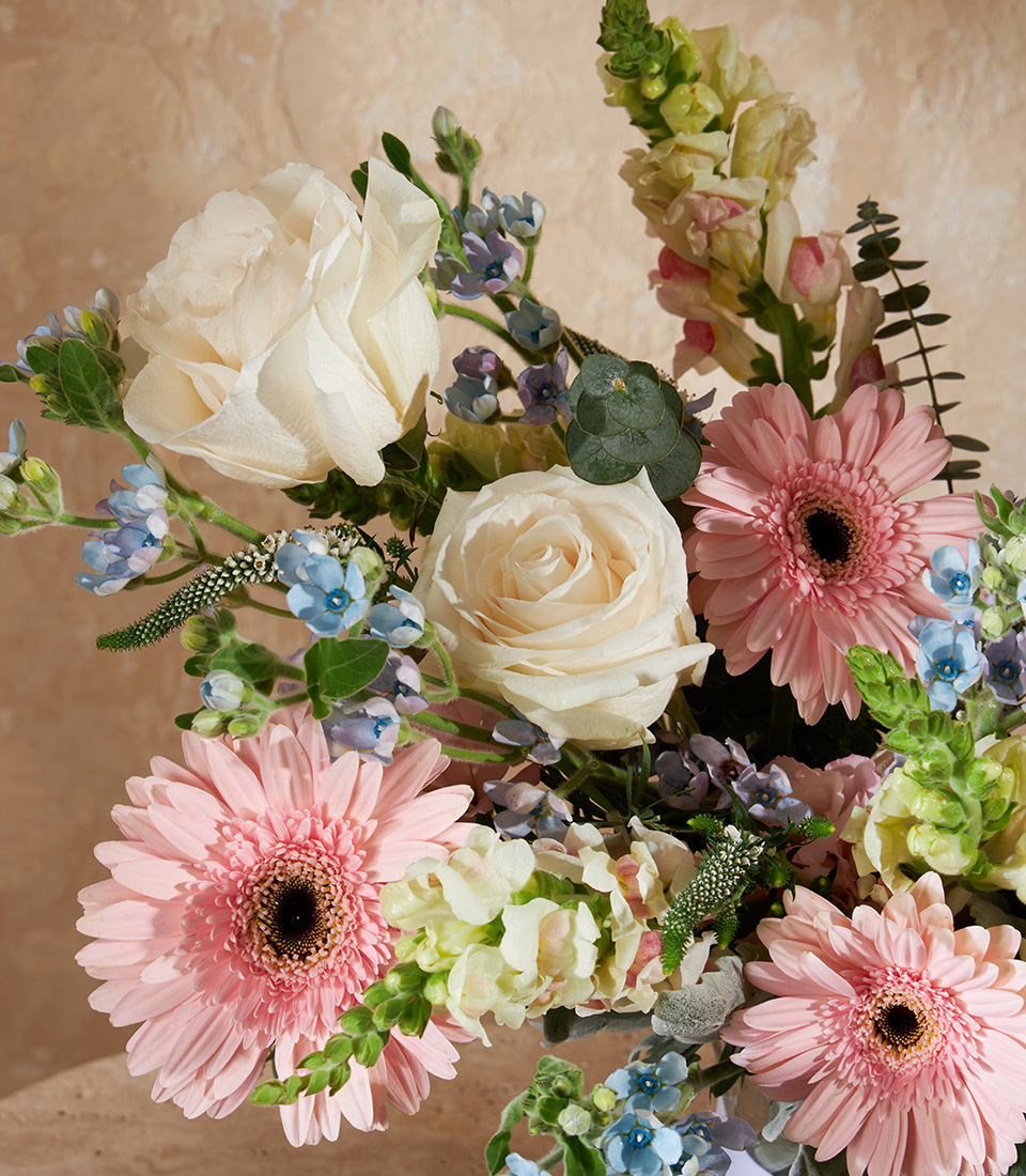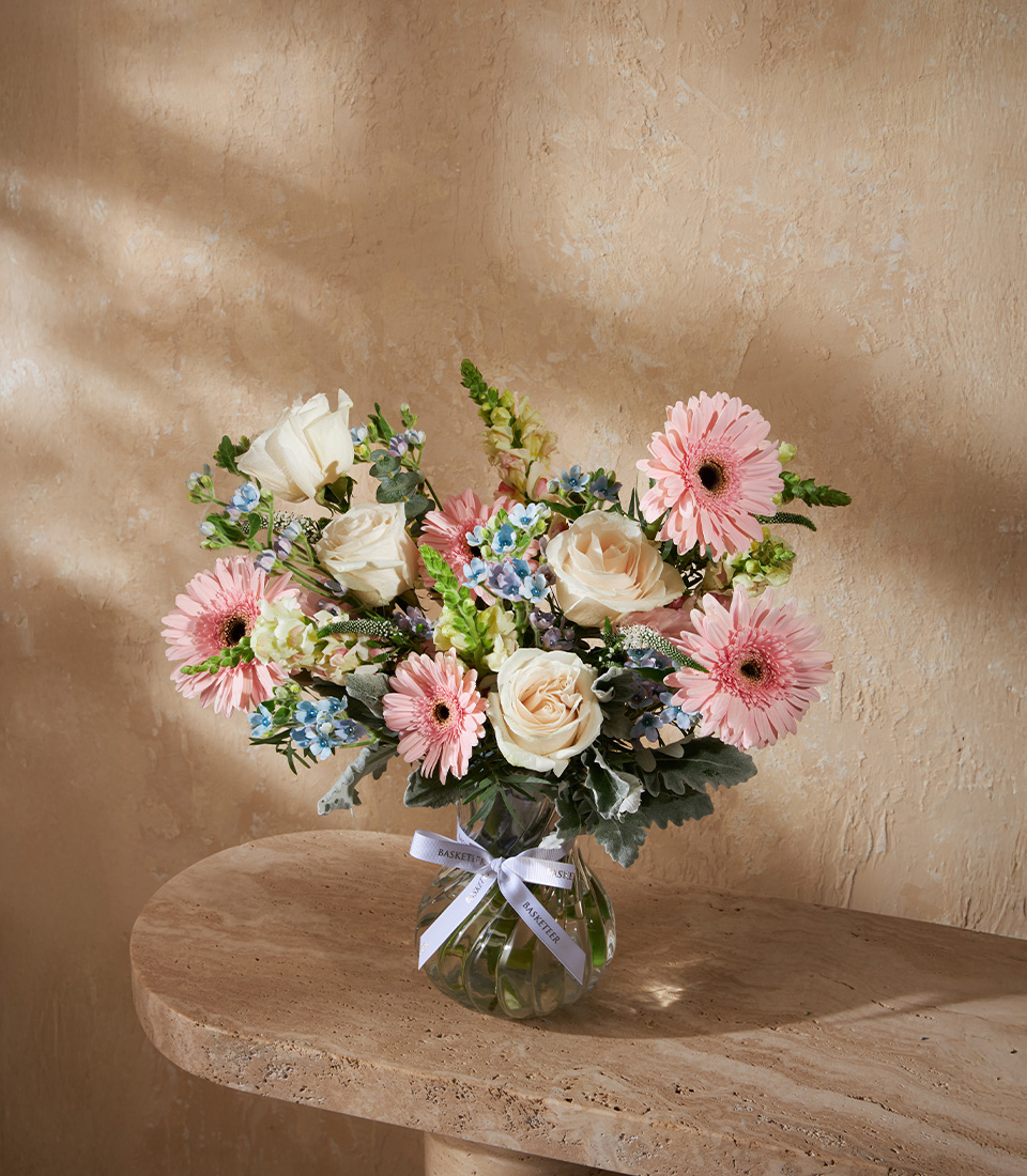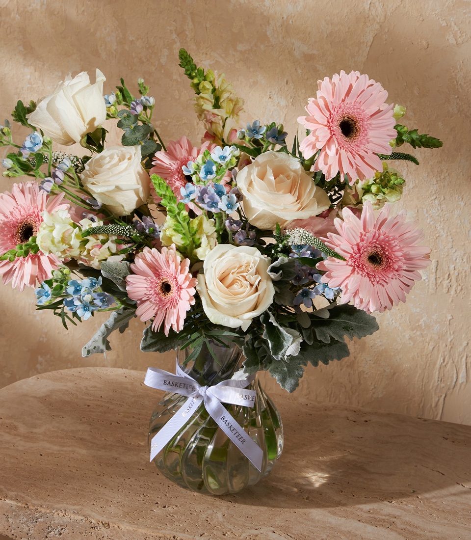 Pastel Grace Vase Arrangement A delicate vase arrangement of premium Vendela Roses imported from Ecuador, combined with pastel blooms in a clear round glass vase, designed to bring charm and elegance into modern living spaces.