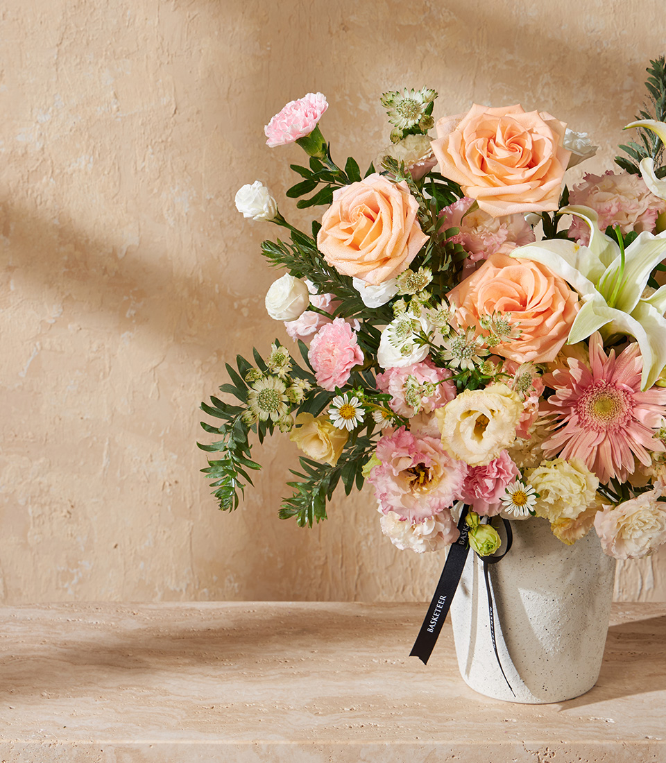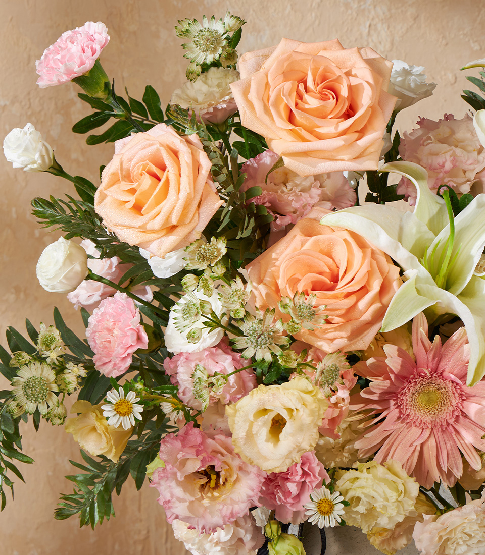Charming vase arrangement with peach roses, white lilies, pink gerberas, and soft blooms. A perfect floral gift for birthdays, anniversaries, or elegant occasions.