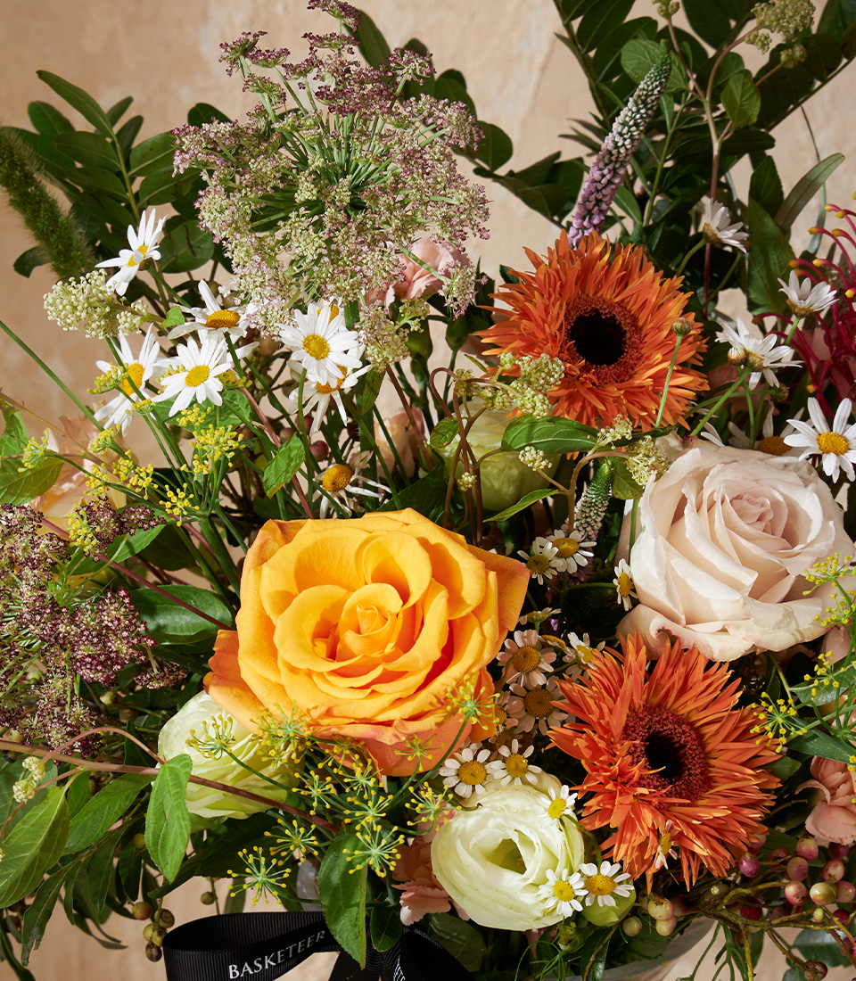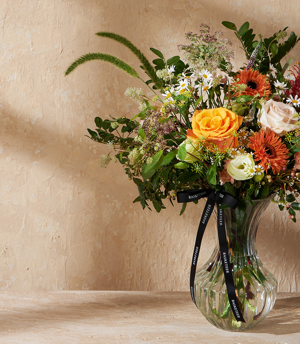 Bright vase with orange roses, gerberas and wildflowers Designed for cheerful gifting Perfect for birthdays anniversaries and joyful surprises in Bangkok