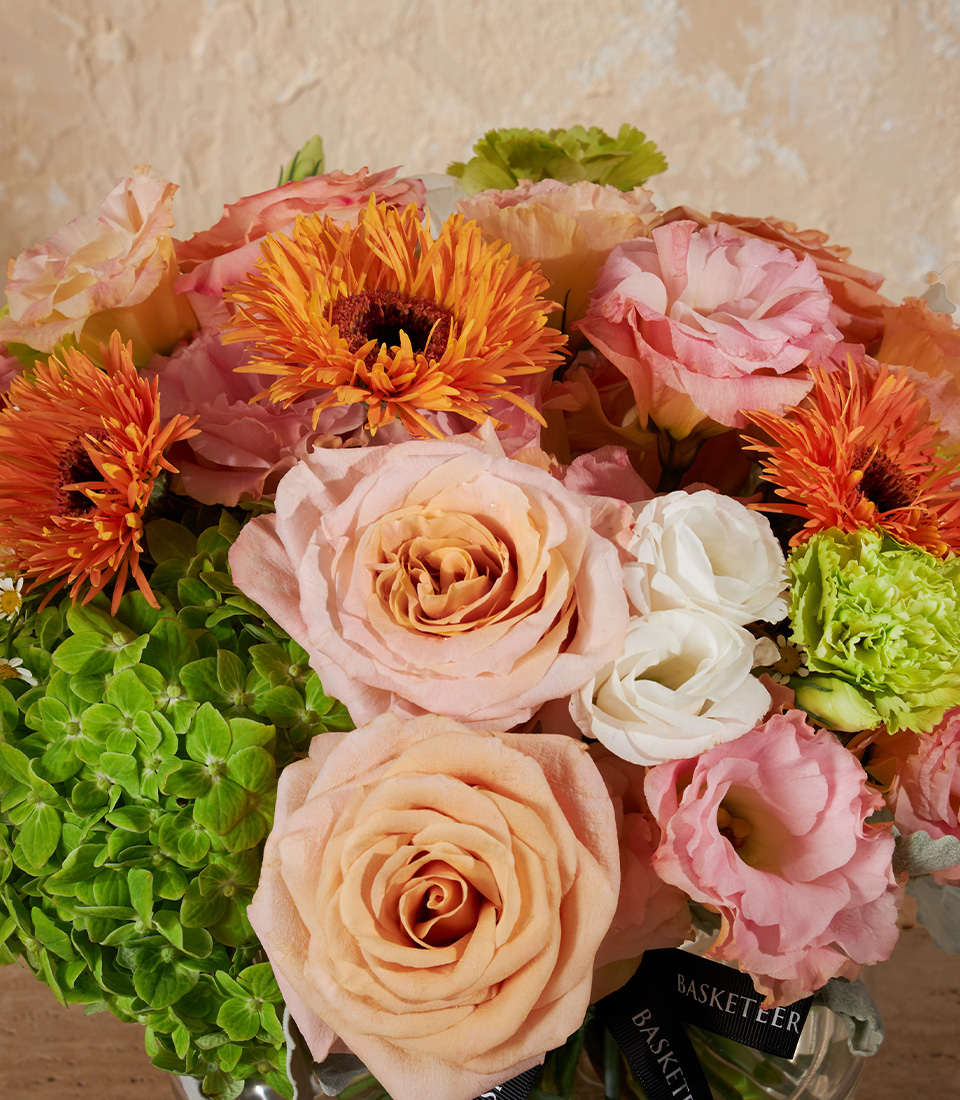 Radiant Harmony Vase Arrangement A charming mini vase featuring Shimmer Roses, complemented with hydrangeas, lisianthus, carnations, and gerberas in peach–green–orange tones, bringing a fresh and warm ambience