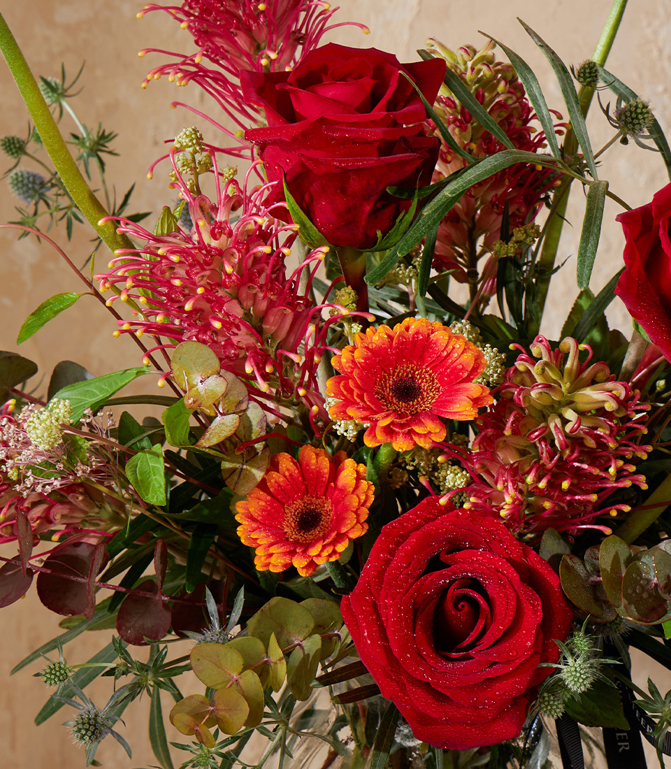 Vibrant vase with red roses orange gerberas and tropical accents A striking floral gift ideal for celebrations anniversaries or premium flower delivery in Bangkok