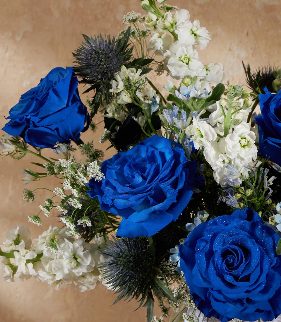 Royal Elegance Vase Arrangement A luxurious vase of Tinted Blue Roses from Ecuador, styled with refined fillers and fresh blooms, creating an elegant arrangement for special occasions.