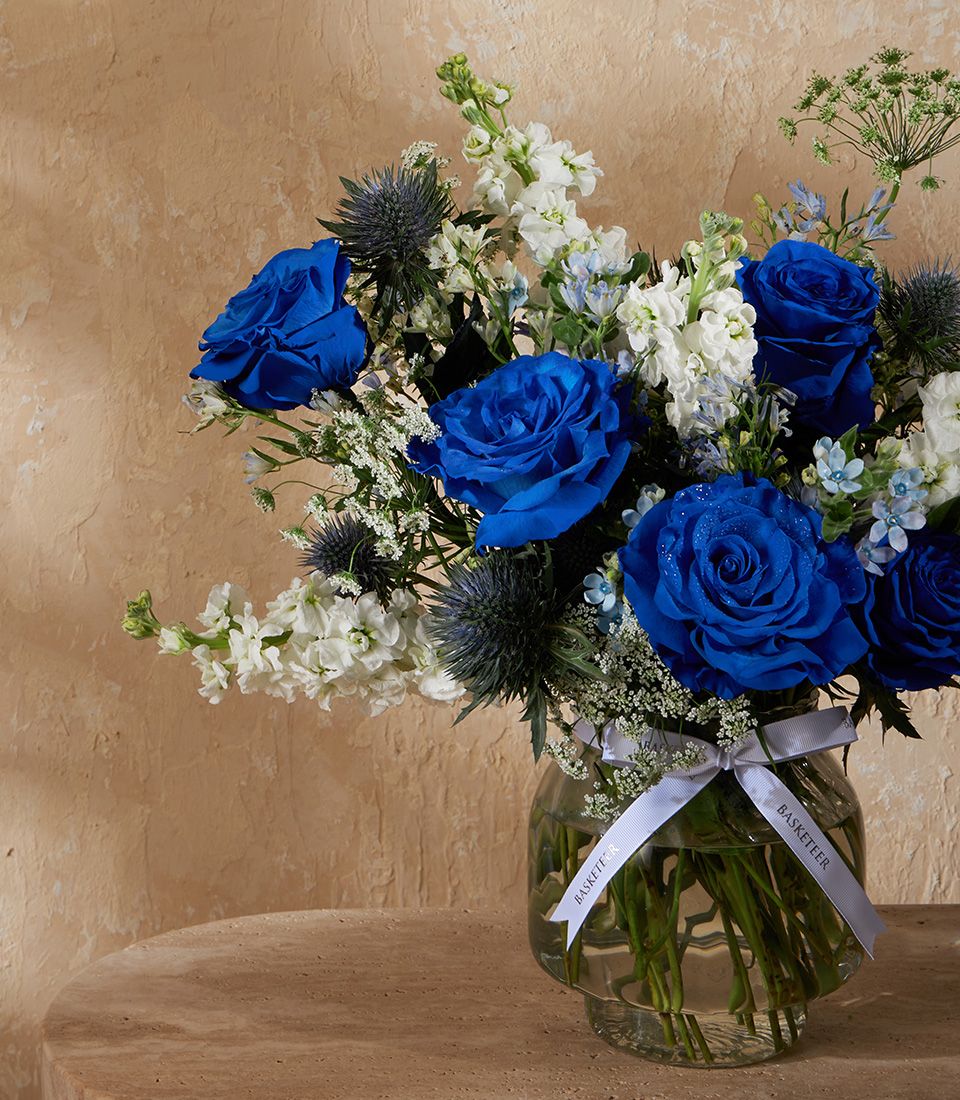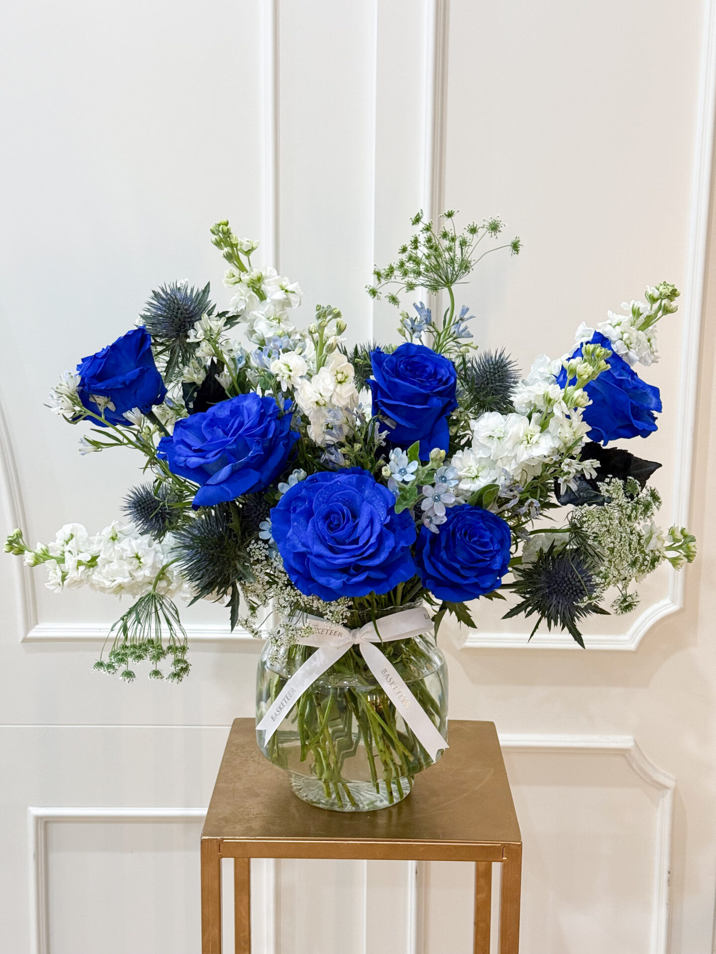 Striking vase with blue roses, white stock, and eryngium. A luxury flower gift in Bangkok, ideal for anniversaries and special occasions.
