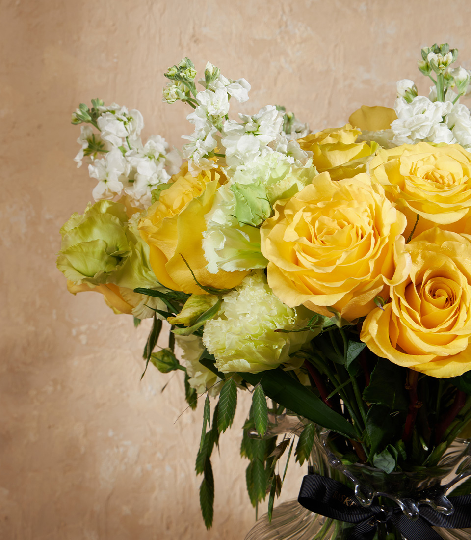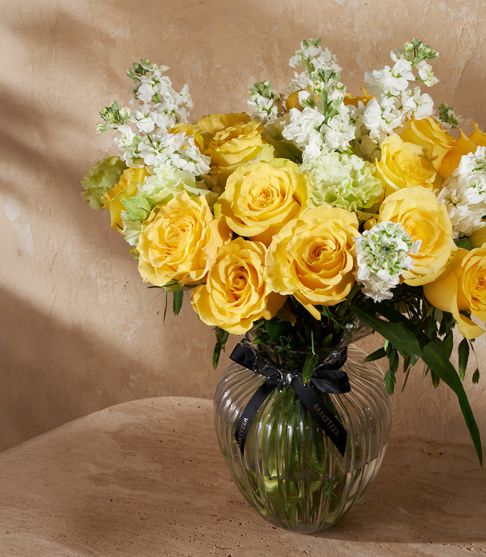 Sunlight Bloom Vase Arrangement This vibrant vase showcases Cubana roses imported from Ecuador, glowing in sunny yellow and paired with white blooms and fresh greens. A perfect floral accent to energise interiors or send joy on birthdays, milestones, and new beginnings.