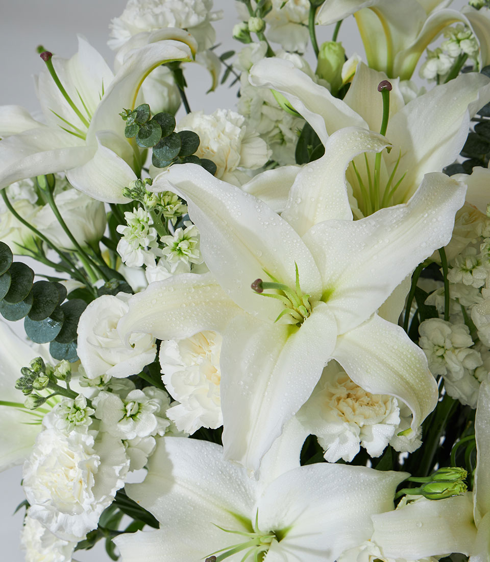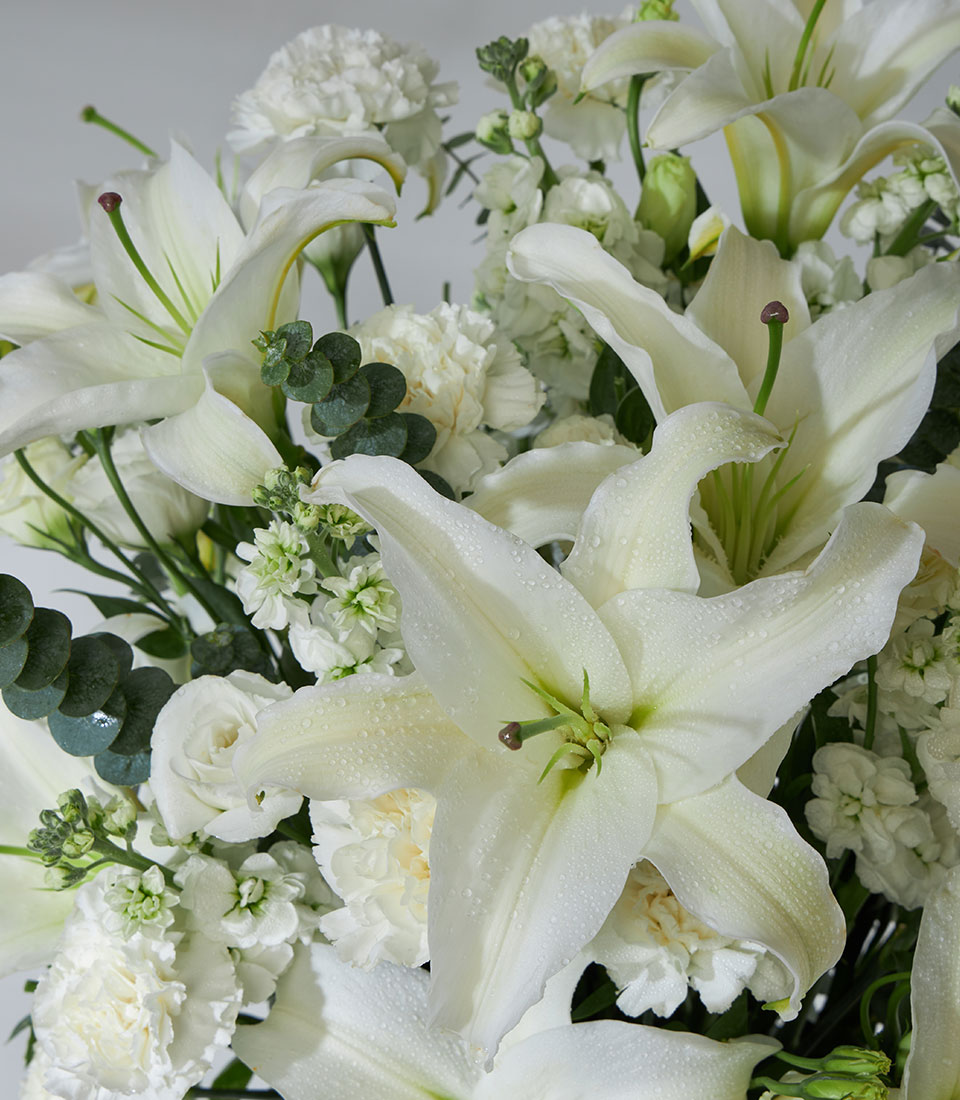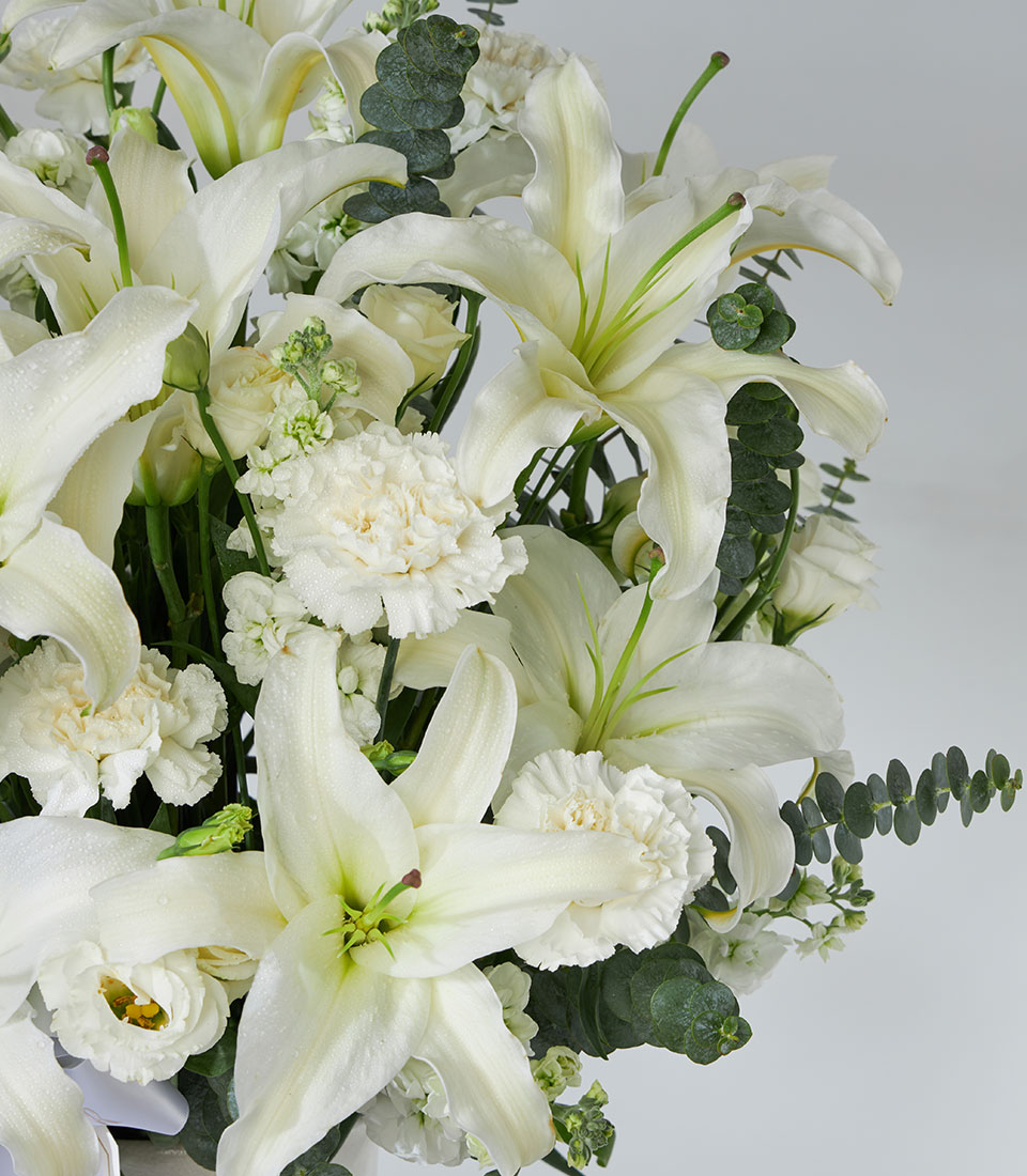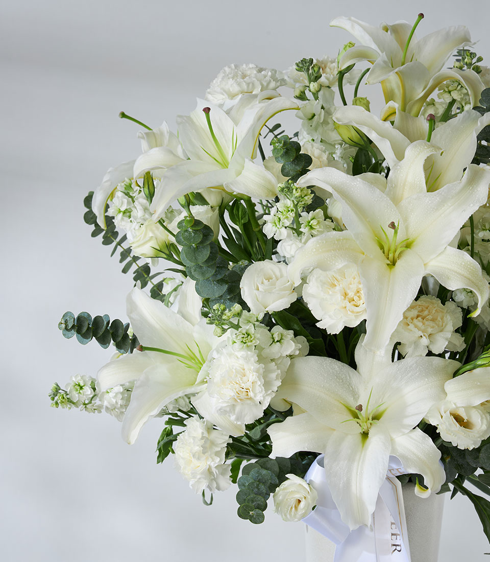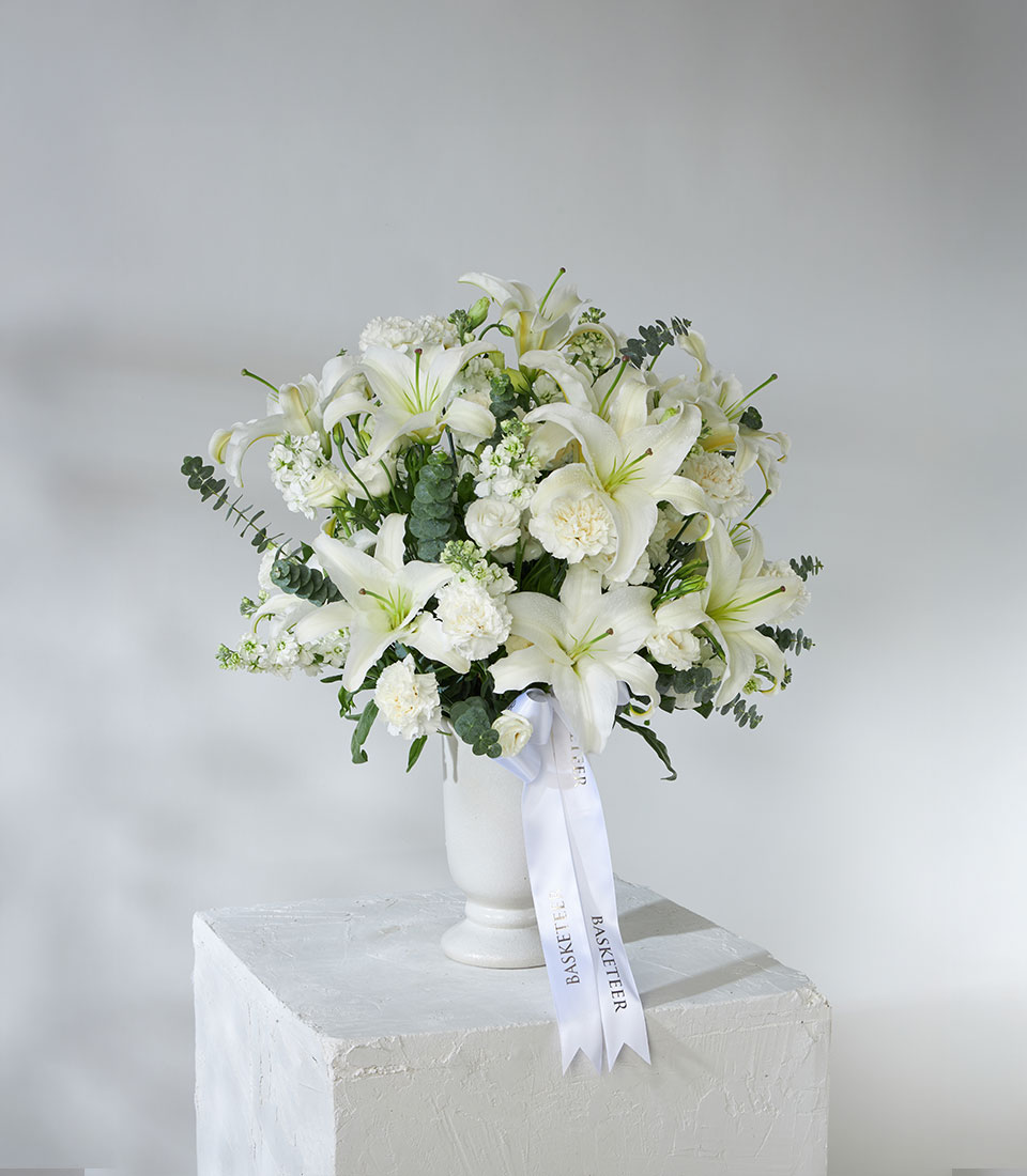 A timeless white flower arrangement featuring premium lilies, carnations, and lisianthus. Designed with elegant structure and soft texture in a white ceramic vase — perfect for graceful gifting and home décor.