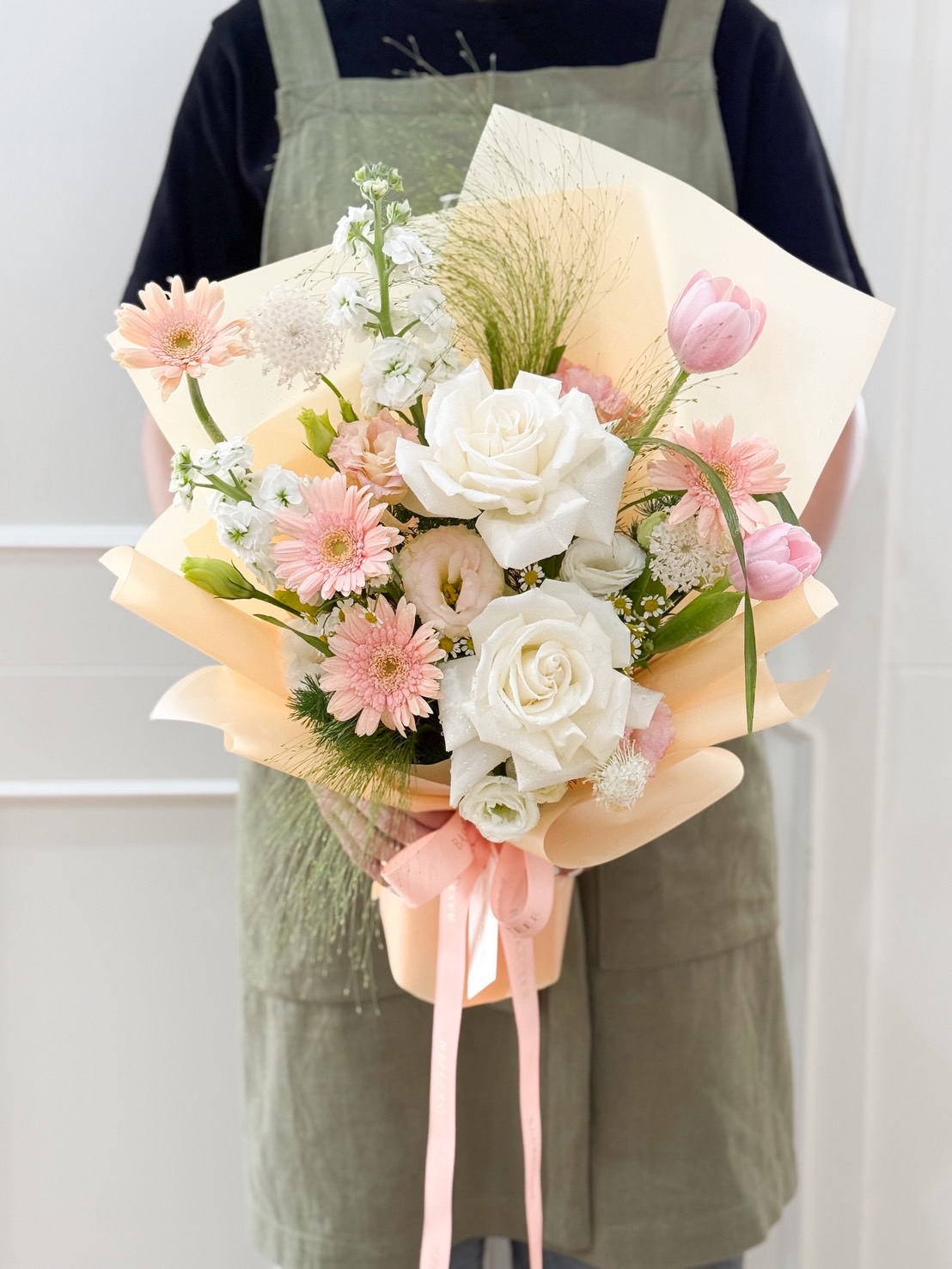 A soft and elegant bouquet of cream roses, peach gerberas, tulips, and wildflower accents. Ideal for birthdays, thanks, or warm wishes.