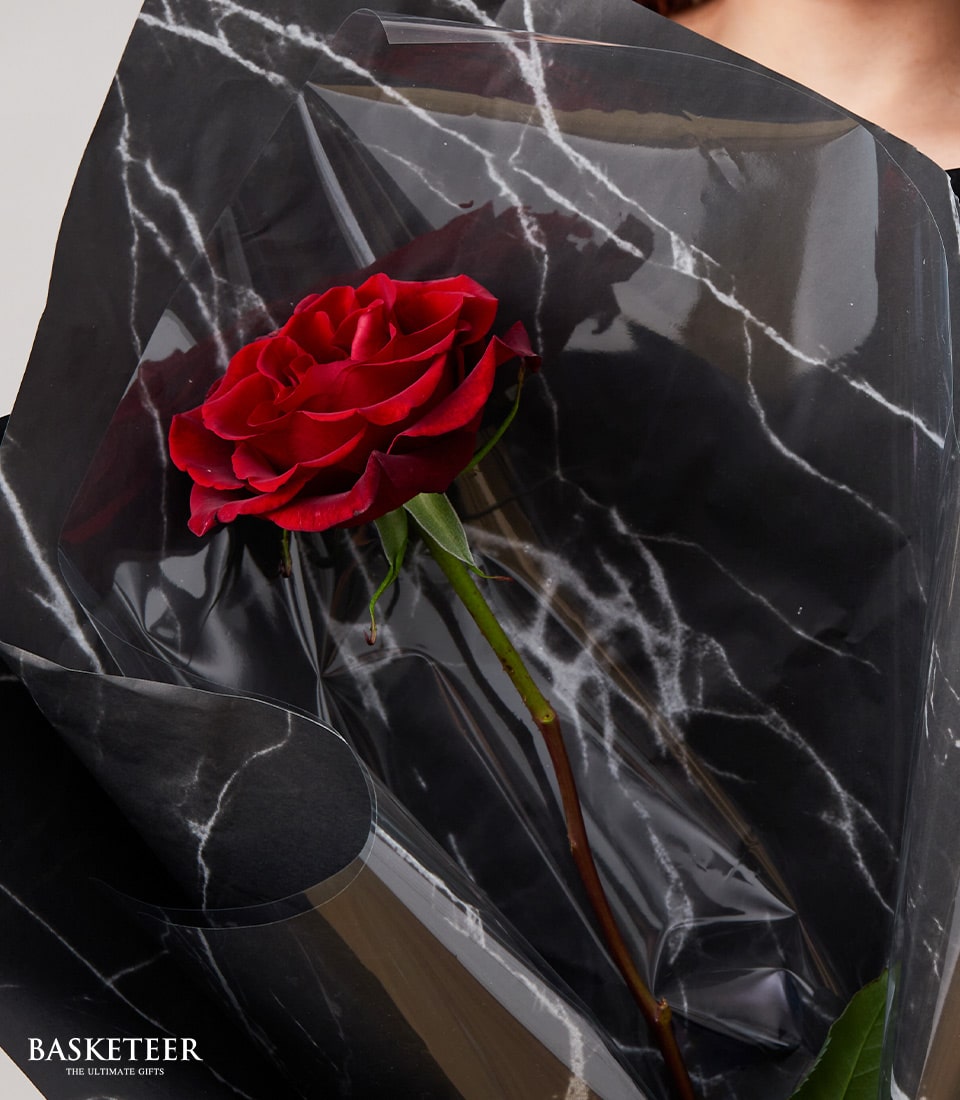 Romantic Single Red Rose Bouquet This sophisticated bouquet showcases a single red rose—classic and meaningful—wrapped in an eye-catching black marble design. Finished with a matching black ribbon, it's a perfect gift for anniversaries, Valentine's Day, or any special moment when elegance speaks louder than words.