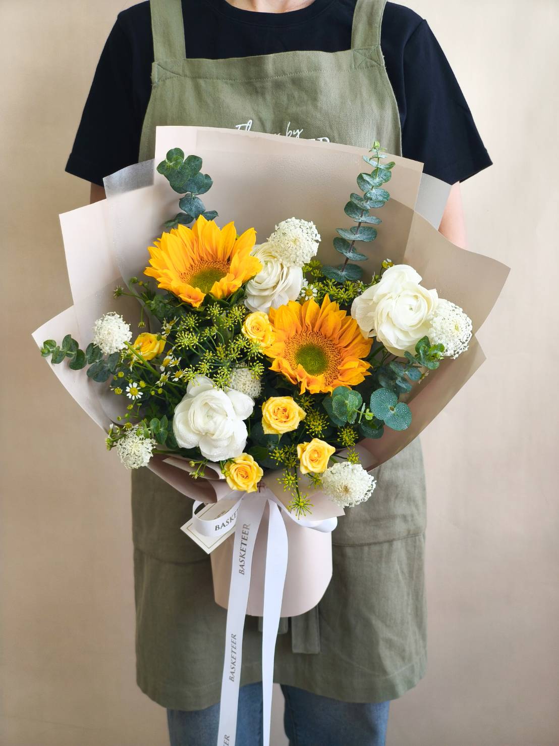 A cheerful bouquet of sunflowers, white ranunculus, and golden roses. Perfect for congratulations, birthdays, or uplifting someone’s day.