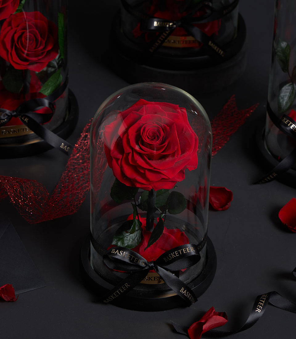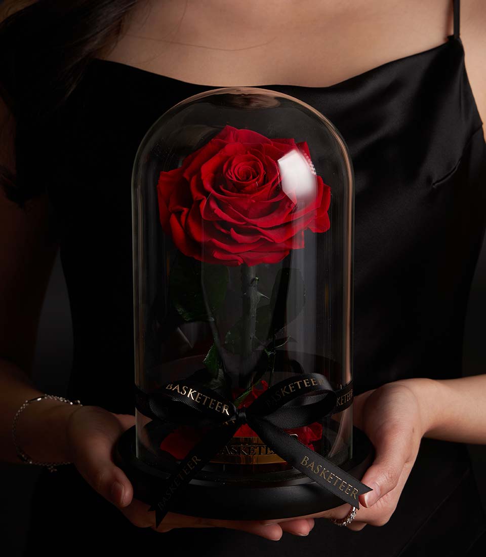 A timeless preserved red rose displayed in an elegant glass dome. A romantic Valentine gift designed to symbolize love that lasts forever.