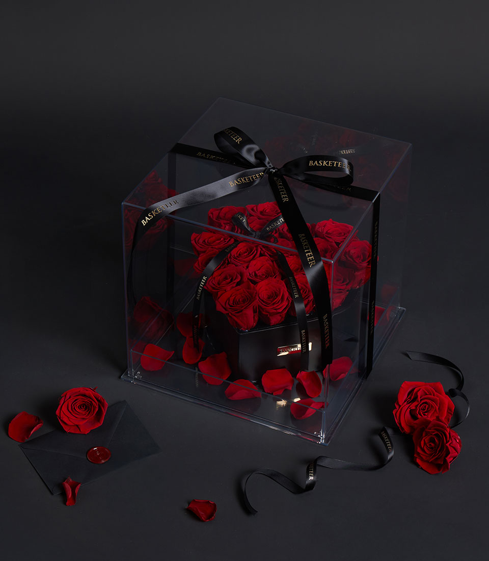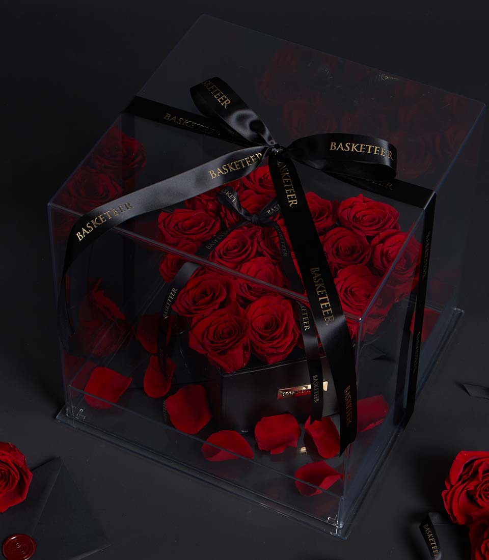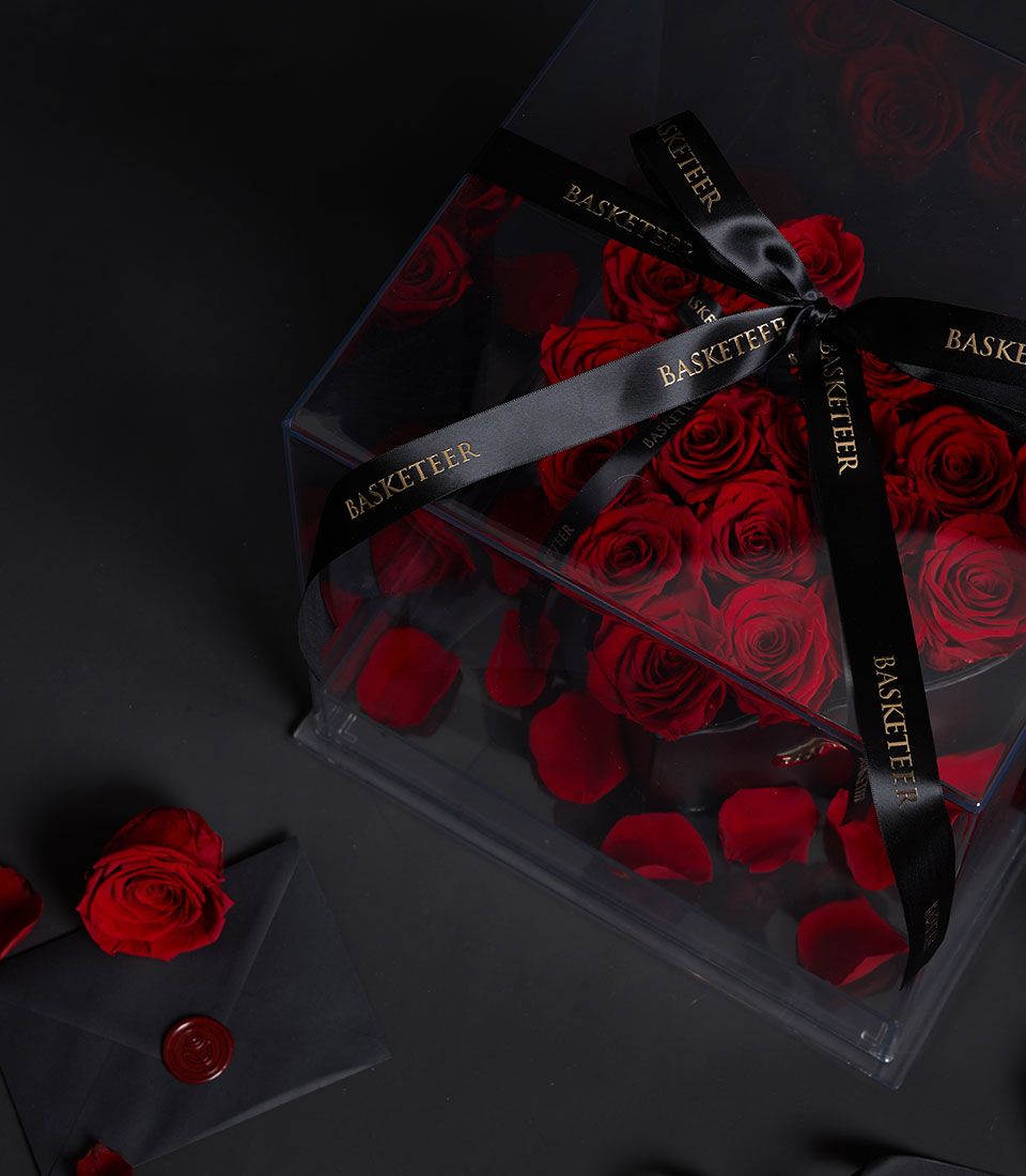 An elegant preserved red rose arrangement presented in a premium clear luxury box, symbolizing everlasting love and refined romance. Designed as a timeless Valentine gift, this forever rose keeps its beauty for years and makes a meaningful romantic gesture for someone special.