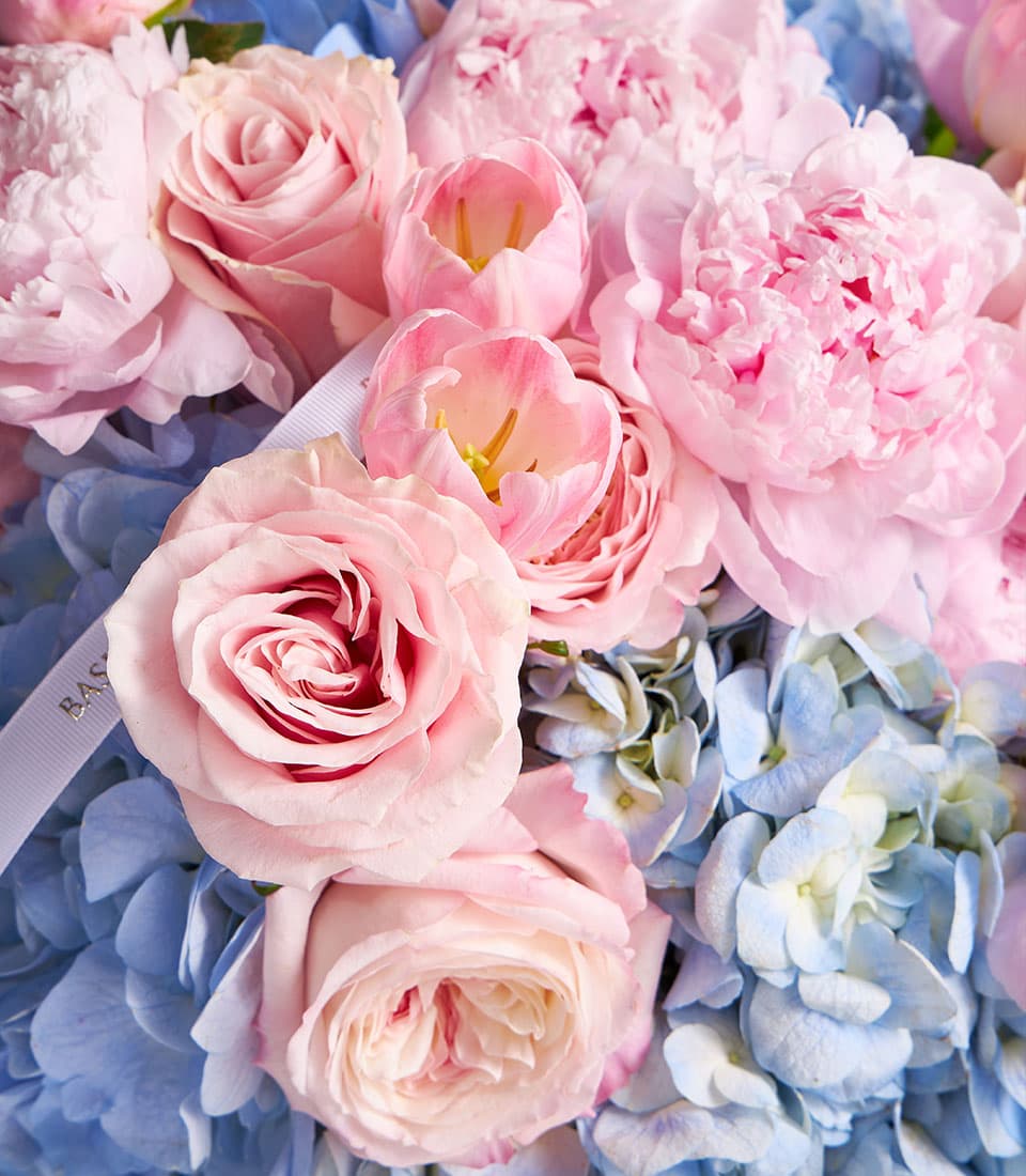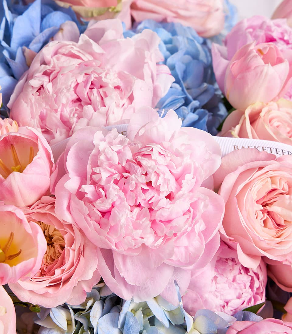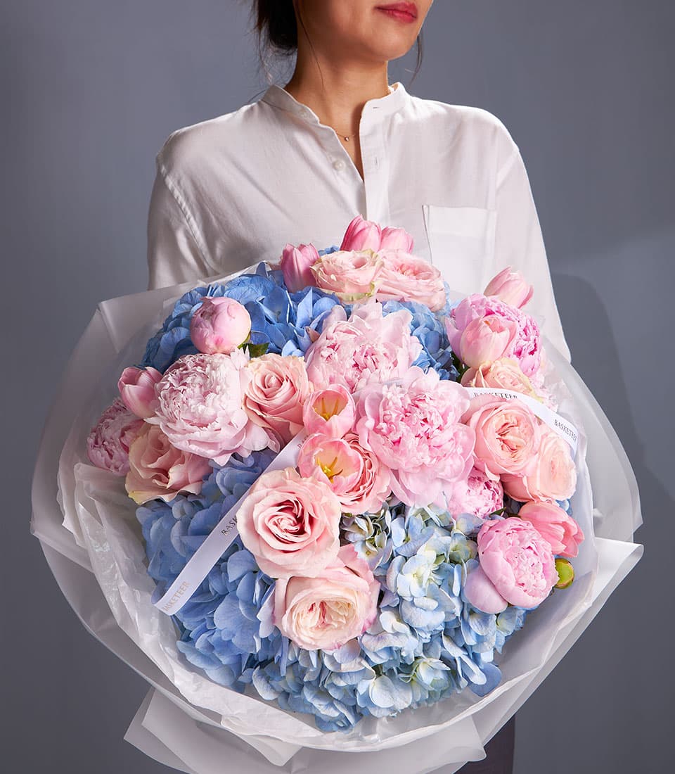 Elegant bouquet of pink peonies roses tulips and blue hydrangeas creating a luxurious pastel harmony perfect for weddings anniversaries and luxury gifting