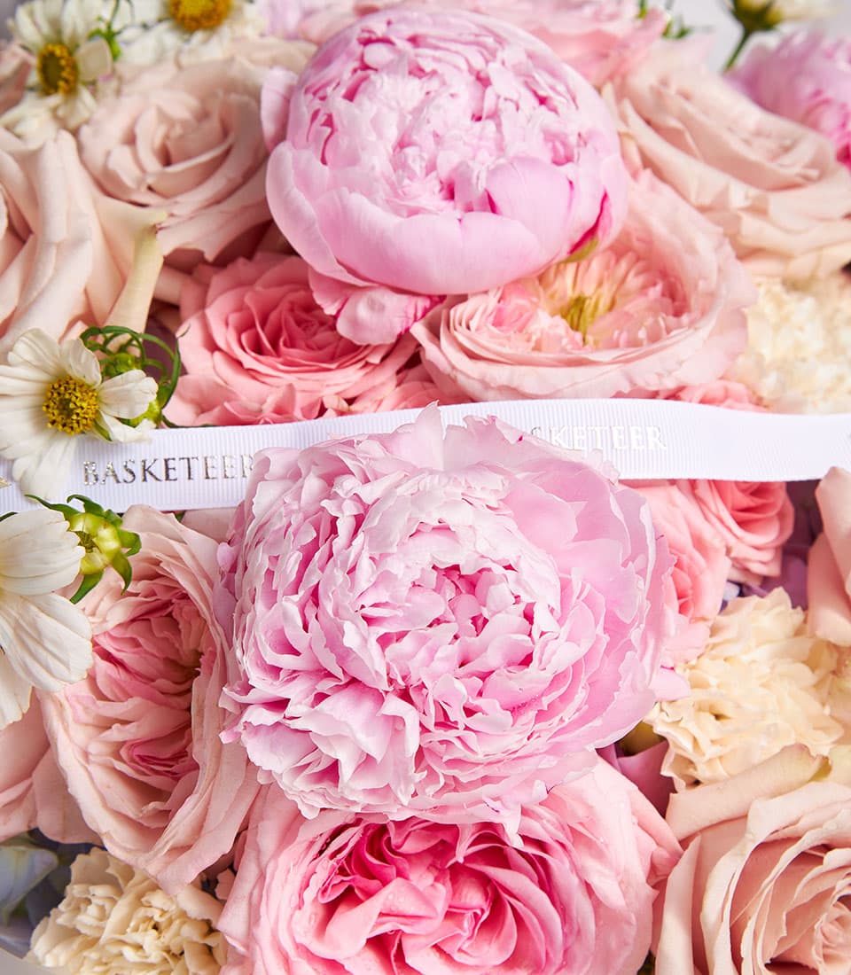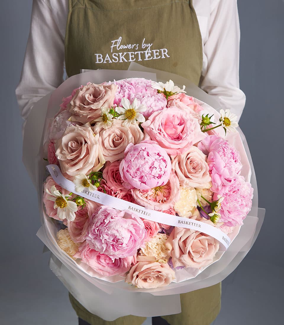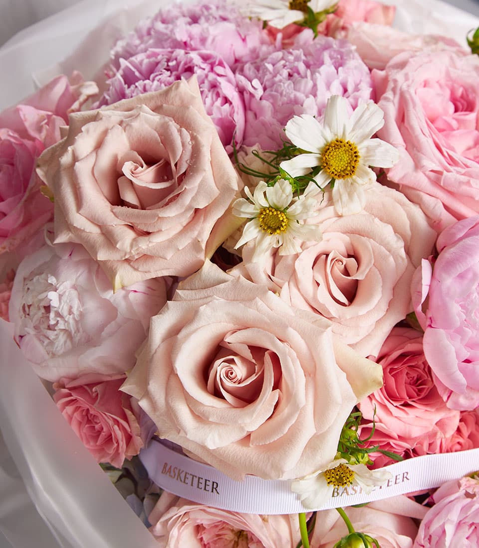 Romantic bouquet of pink peonies and blush roses with chamomile accents perfect for weddings anniversaries and luxury floral gifts