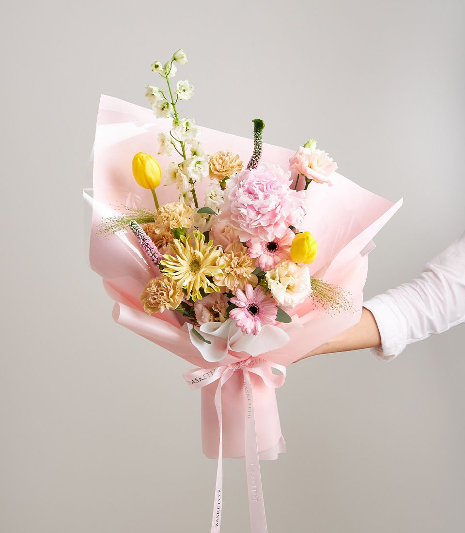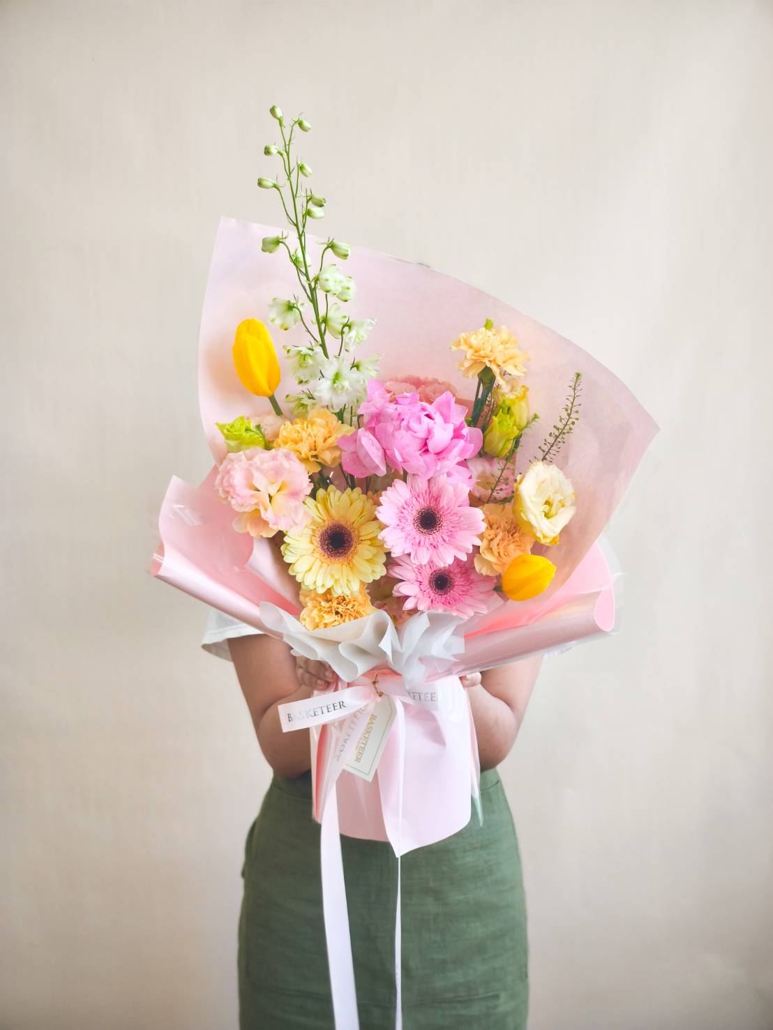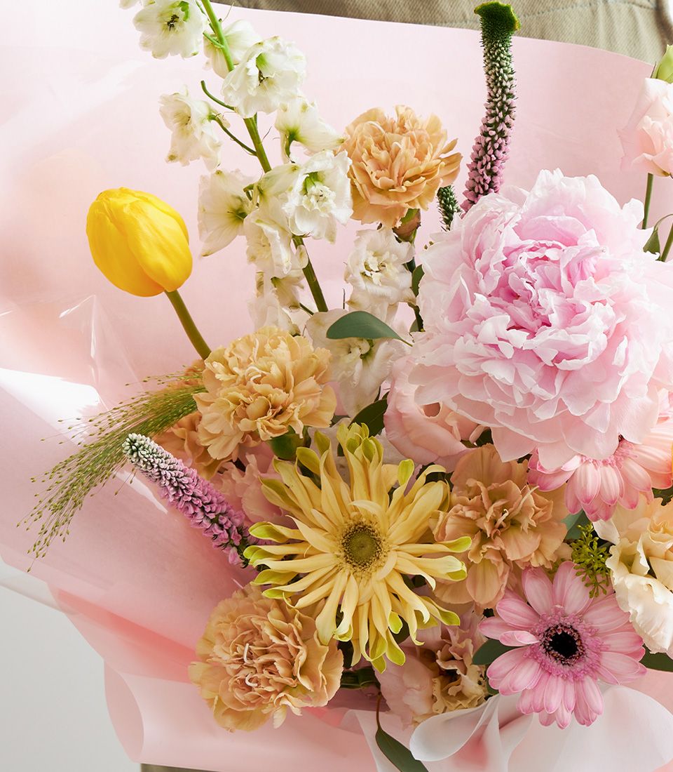 A delightful mix of pink peonies, yellow tulips, gerberas, and carnations—perfect for brightening someone’s day with pastel cheer.