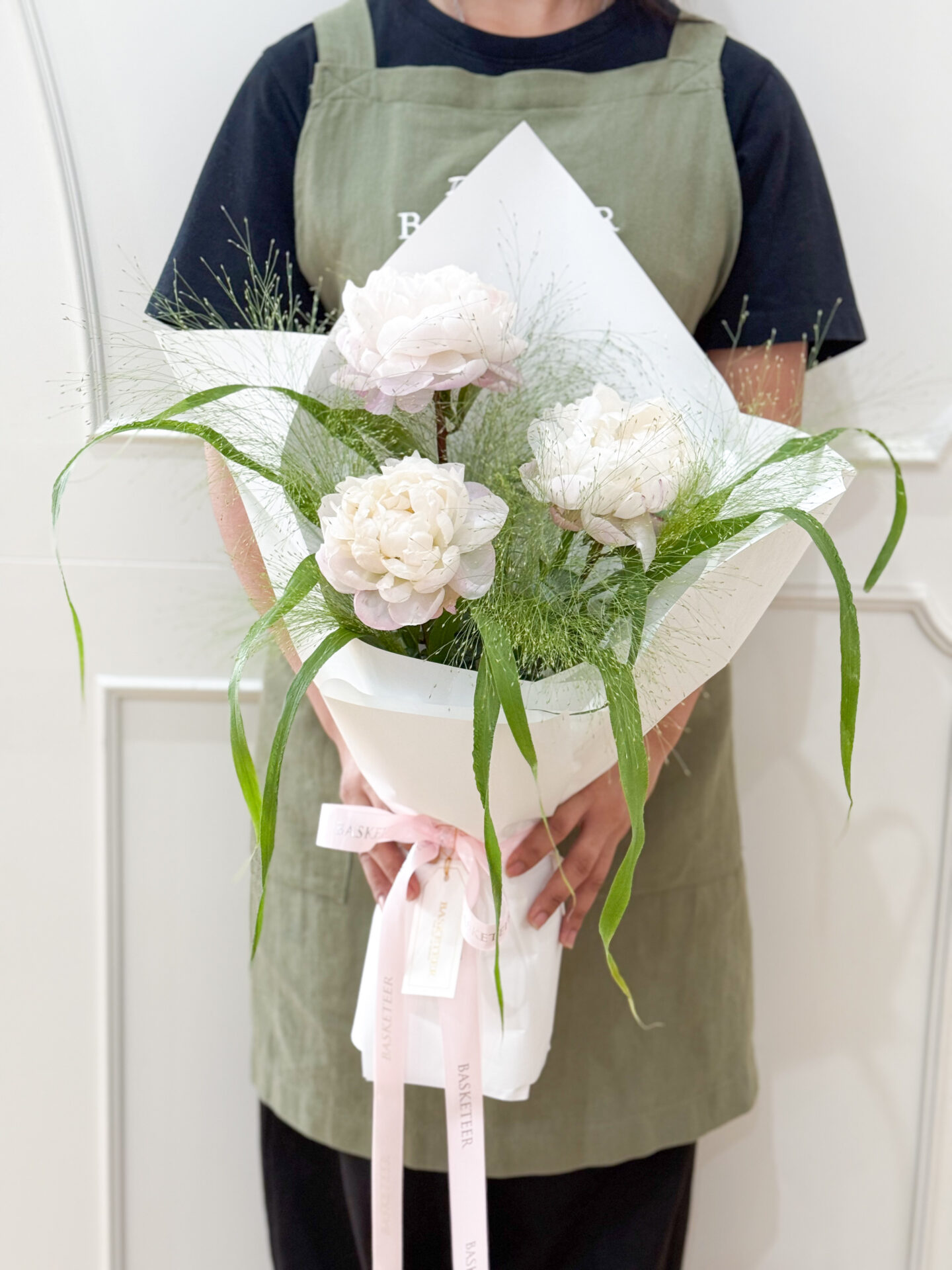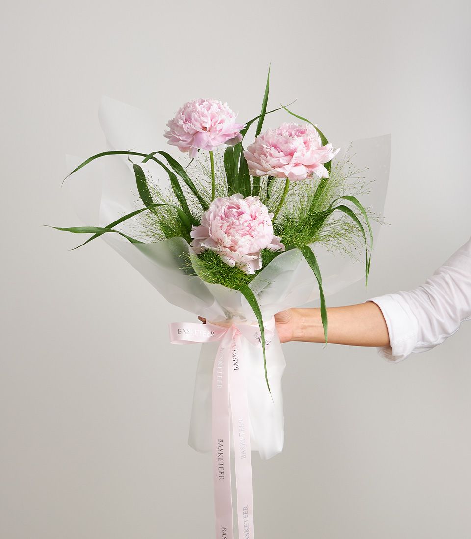 Petite Pink Peony Bouquet A minimalist bouquet of three pink peonies framed with light greenery. Elegant and soft — perfect for romantic gifts or graceful surprises.