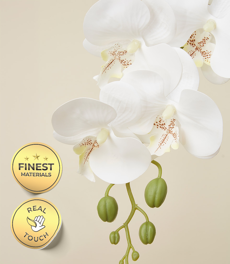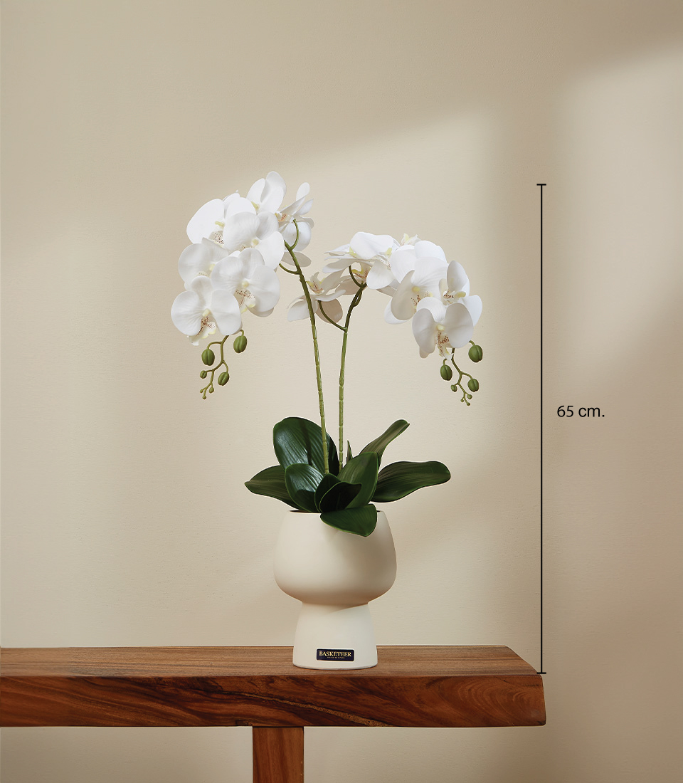 Elevate any space with the Timeless White Orchid Arrangement—lifelike Phalaenopsis in a sleek pot for effortless, lasting elegance.