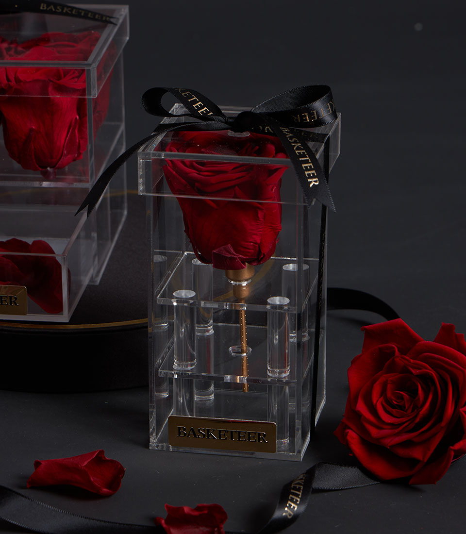A striking preserved red rose presented in a tall crystal-clear acrylic VIP box, designed to symbolise eternal love and refined romance. This elegant Valentine gift is a timeless keepsake that expresses deep affection, making it a perfect luxury Valentine gift or romantic surprise.
