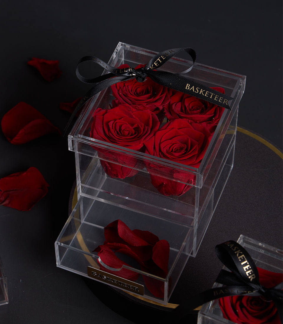 A luxurious arrangement of preserved red roses presented in a crystal-clear acrylic VIP box, symbolising everlasting love and timeless romance. Designed as an elegant Valentine gift and romantic keepsake, this premium preserved rose box is perfect for expressing deep love on Valentines Day or any special occasion.