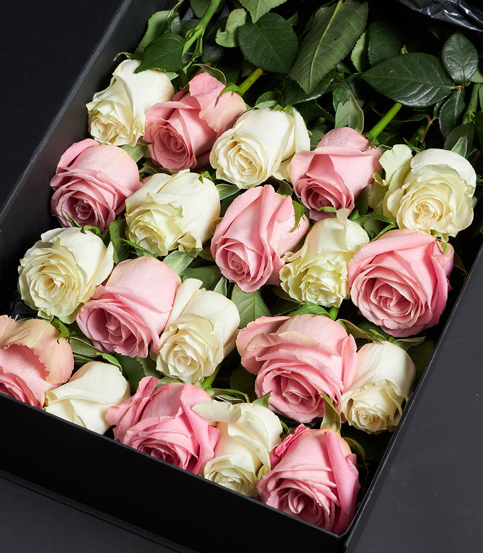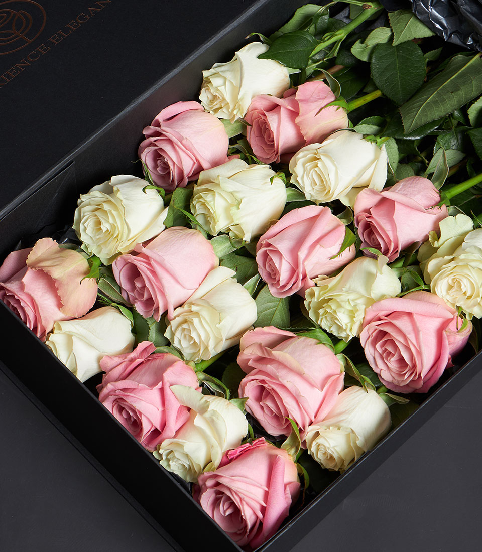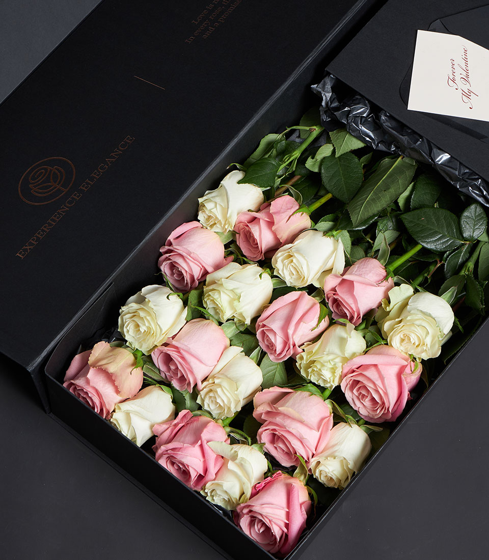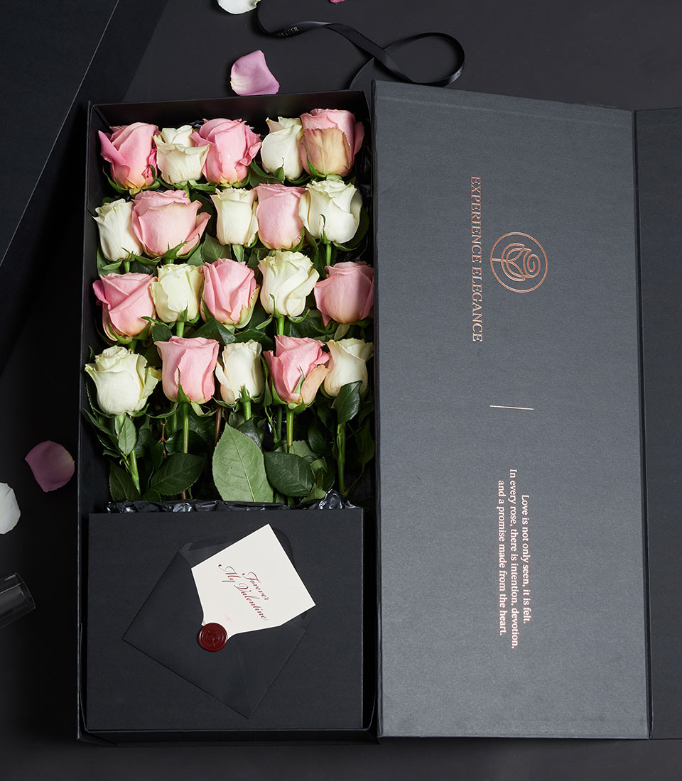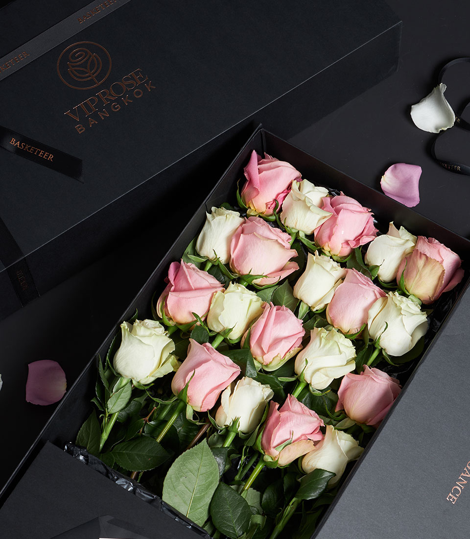 A graceful and romantic Valentine gift featuring premium Hermosa pink roses paired with elegant white Playa Blanca roses, imported from Ecuador. Arranged in a luxurious VIP rose box, this sophisticated rose bouquet gift is designed to express love, admiration, and heartfelt appreciation with timeless beauty.