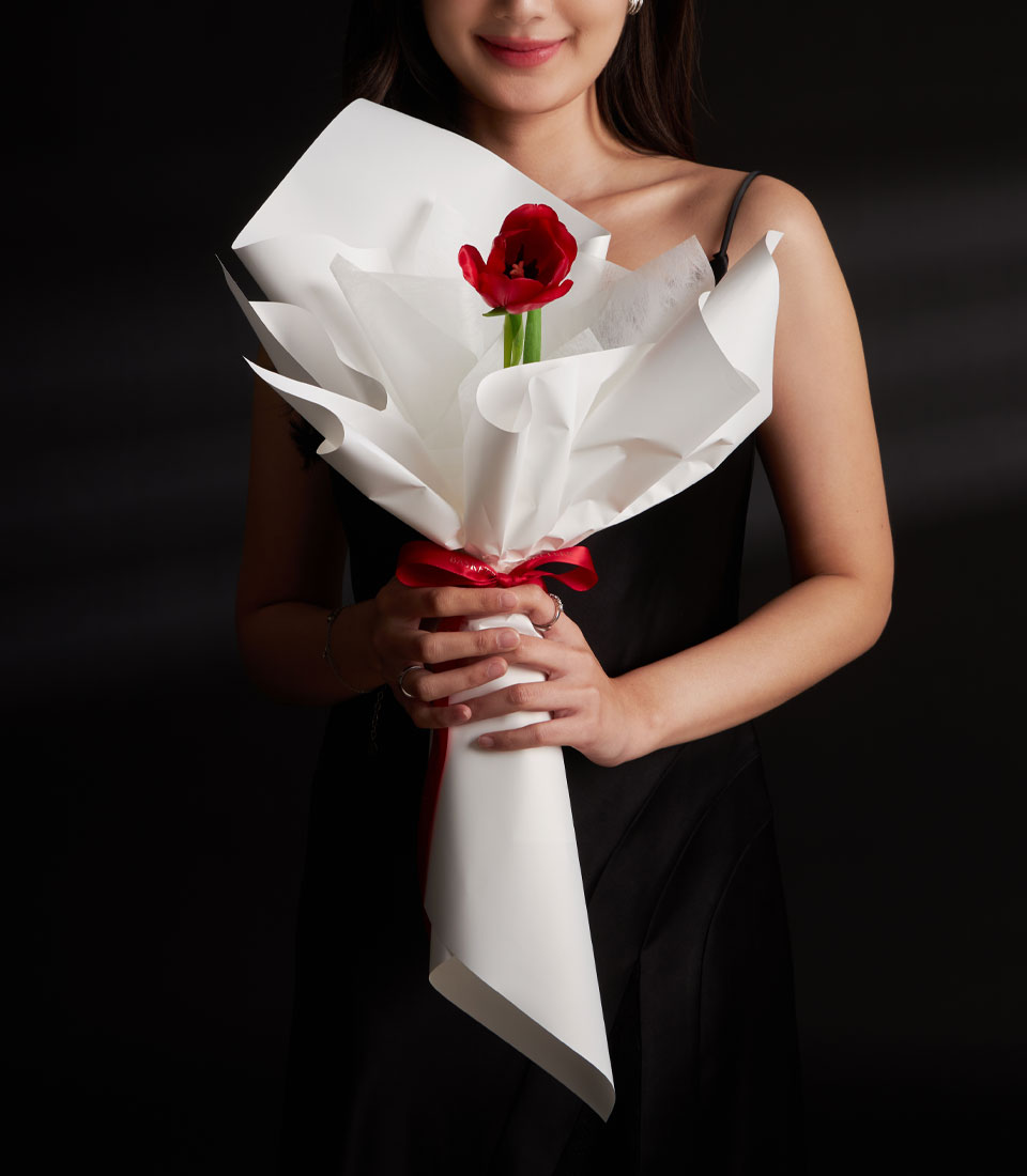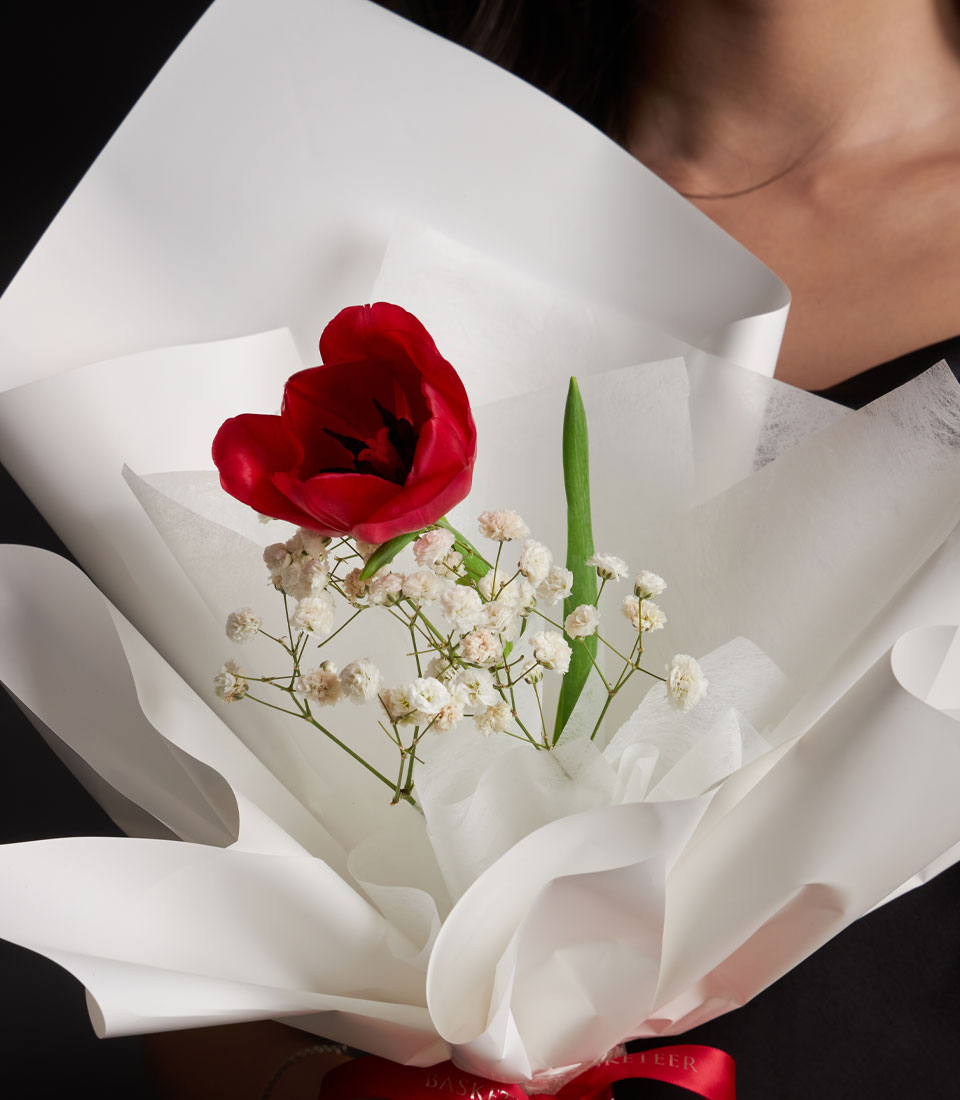 An elegant Valentine bouquet featuring premium red tulips paired with delicate white gypsophila. Softly wrapped in a modern luxury style, this romantic flower bouquet is a graceful Valentine gift, perfect for expressing love, admiration, and heartfelt moments with same-day delivery in Bangkok.