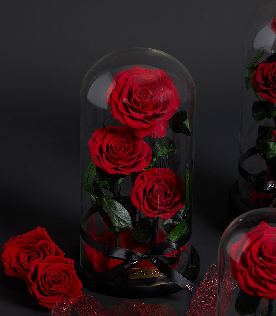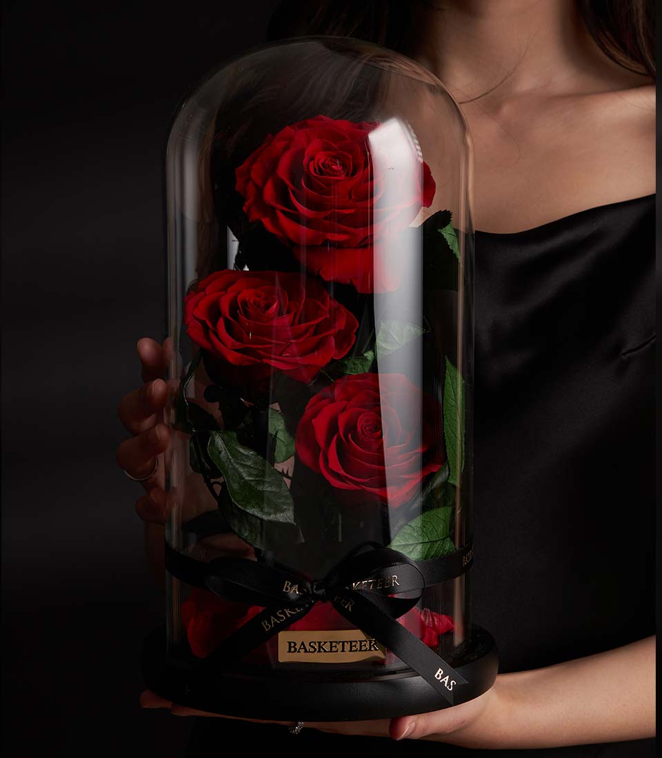An elegant Valentine gift featuring preserved red roses beautifully arranged in a classic glass dome. Designed to symbolize eternal love and lasting romance, this timeless rose gift creates a meaningful Valentine's surprise and a lasting keepsake for someone truly special.