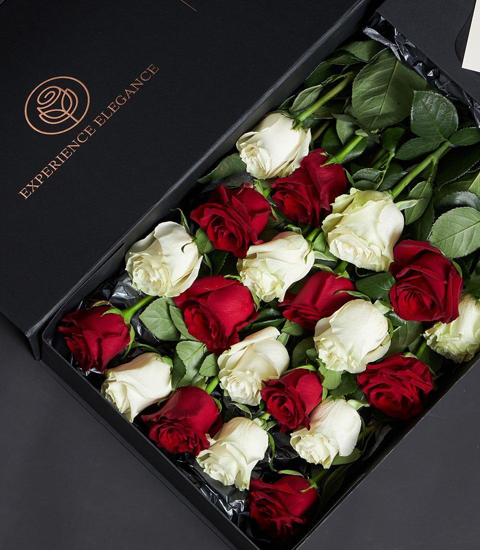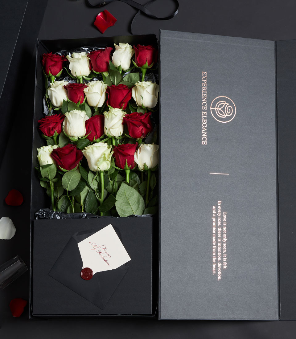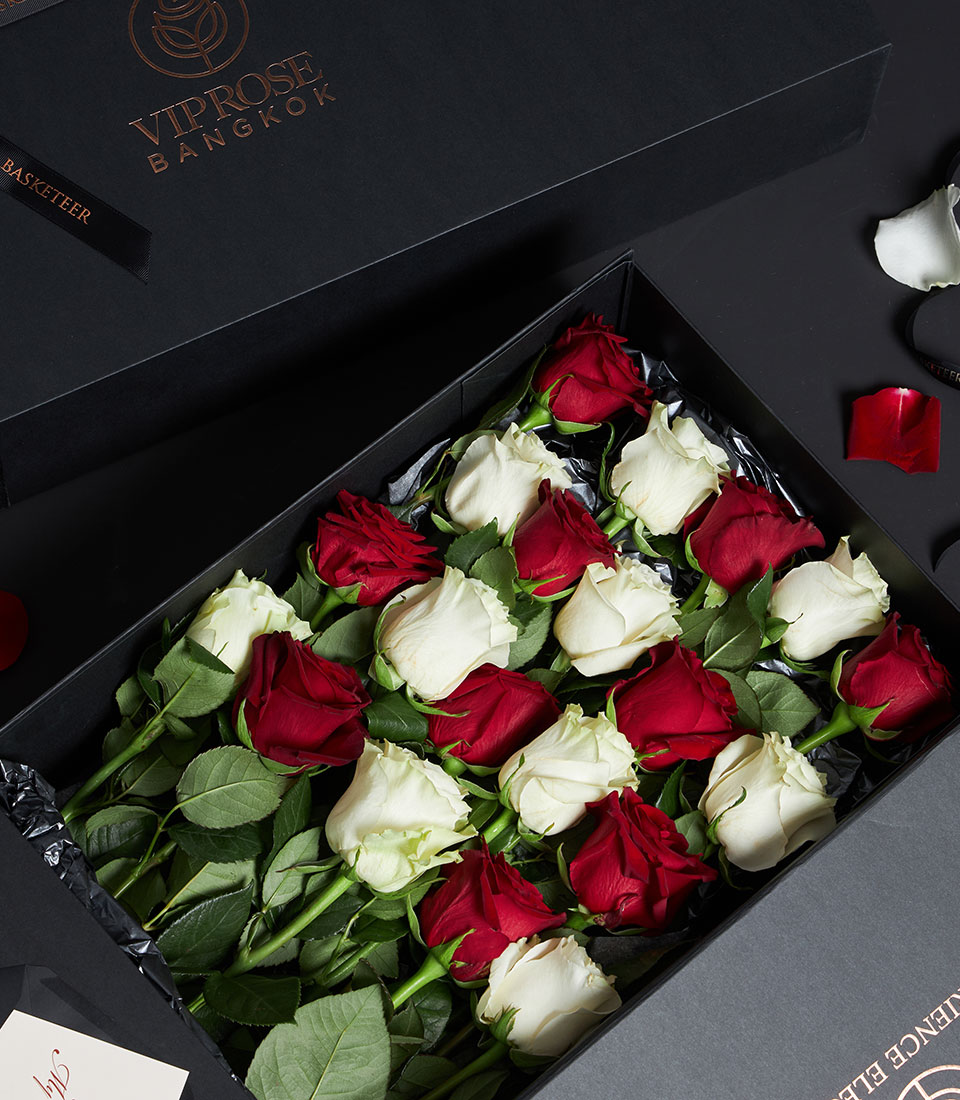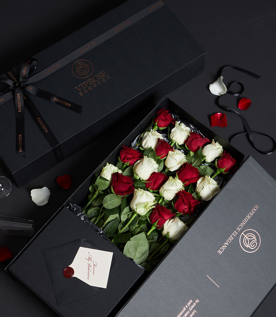 A timeless expression of romance and elegance, this luxury Valentine gift box features a refined mix of red Explorer roses and white Playa Blanca roses imported from Ecuador. Beautifully arranged in Basketeer's signature VIP rose box, this premium rose bouquet gift is designed to impress and convey love, admiration, and heartfelt sentiment.