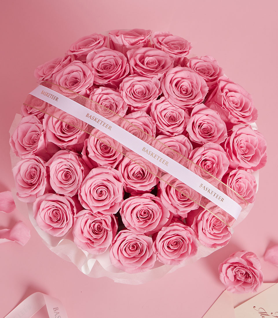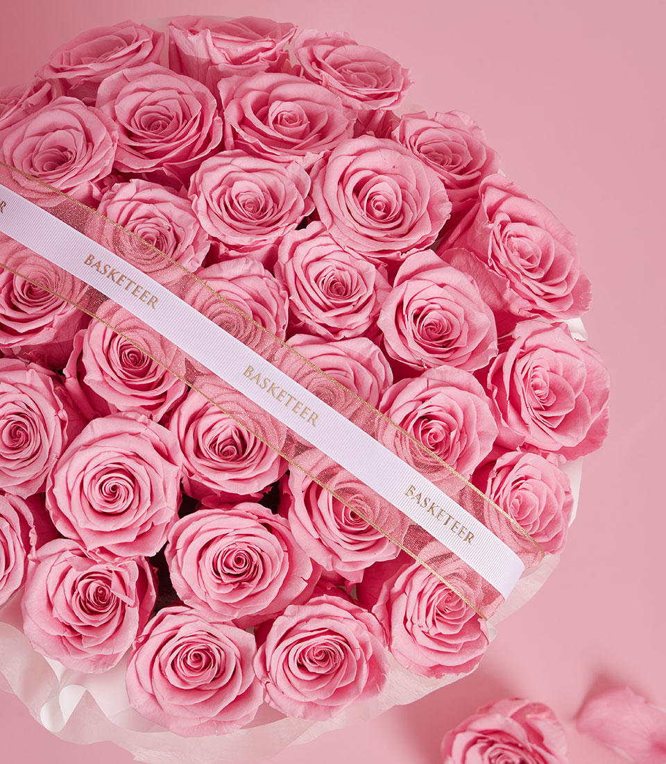 A stunning display of premium preserved pink roses, artistically arranged in our $20 times 23$ cm signature VIP round box (BX-189-S). These real "eternal" roses are carefully treated to maintain their soft, natural texture and radiant color for years. Finished with a luxury Basketeer ribbon, this arrangement offers a perfect balance of modern style and timeless romance for Valentine’s 2026. Handcrafted by Flowers by Basketeer.