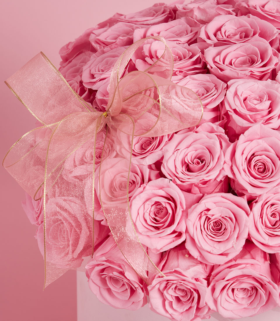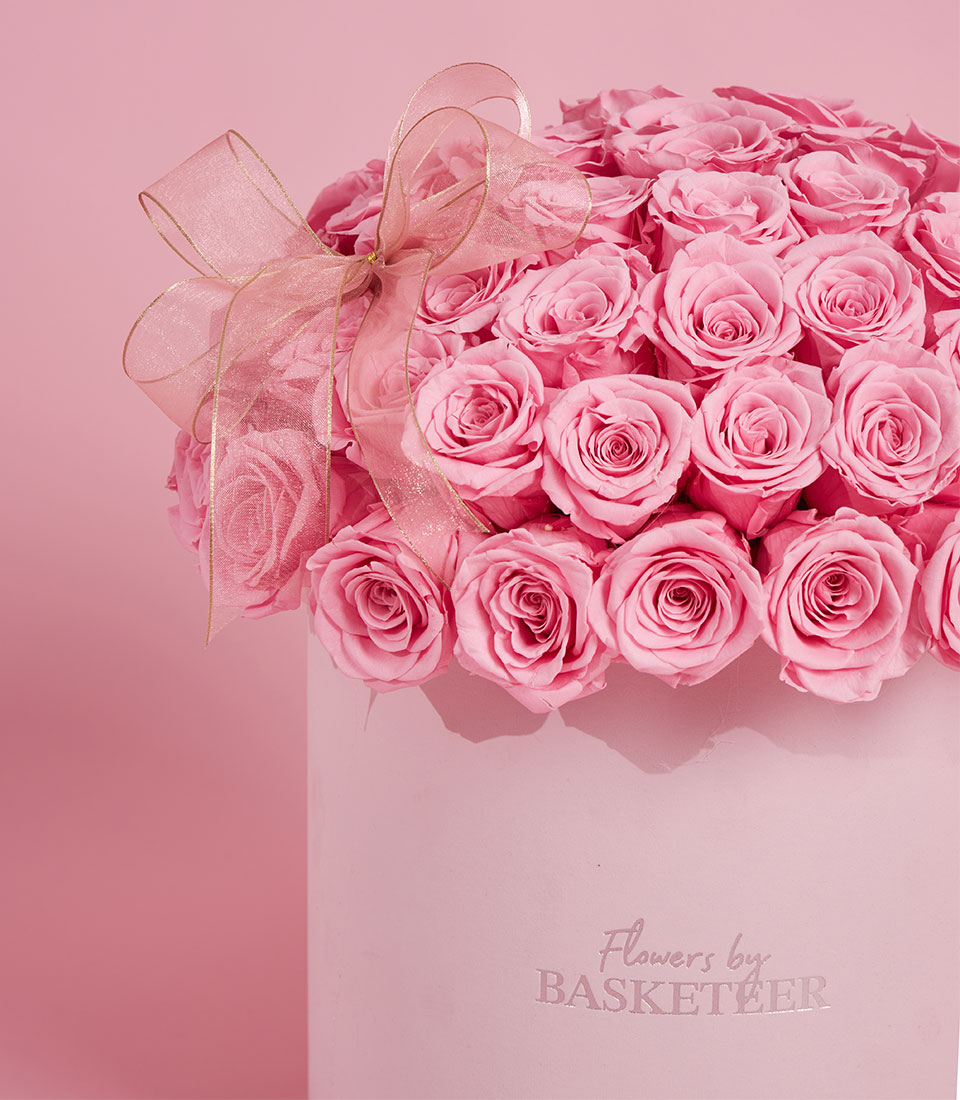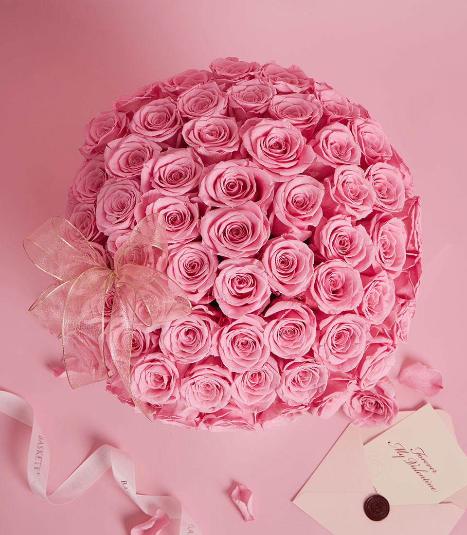 An opulent masterpiece of romance featuring a grand dome of premium preserved pink roses, meticulously arranged in our signature $26 times 28$ cm VIP round box (BX-189-L). These real "eternal" roses retain their delicate texture and vibrant hue for years without any maintenance. Finished with a luxury gold-trimmed bow, this statement arrangement by Flowers by Basketeer is the ultimate expression of everlasting devotion for Valentine’s 2026.