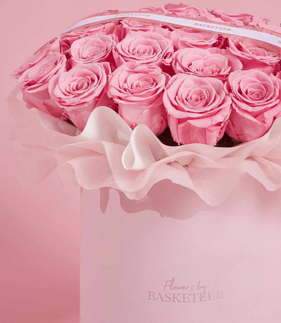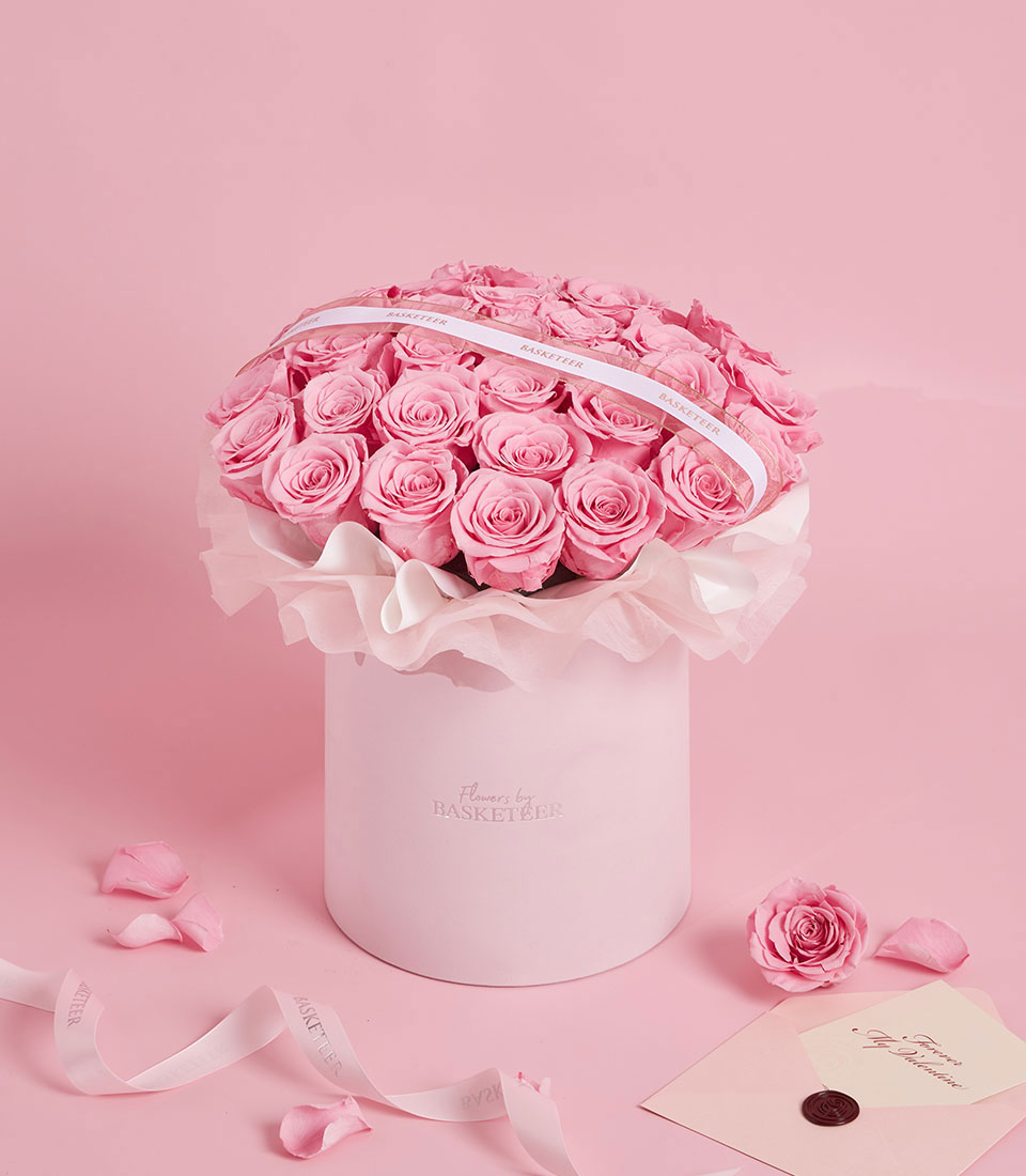 An enchanting Valentine’s pairing featuring a lush dome of premium preserved pink roses in our $20 times 23$ cm VIP round box (BX-189-S) and a cuddly 35 cm Pink Teddy Bear (Doll24-071). These real roses are specially preserved to stay vibrant for years, serving as a lasting symbol of your affection. Complete with a designer plush, this Flowers by Basketeer set is a heartwarming way to say "I love you" this 2026.