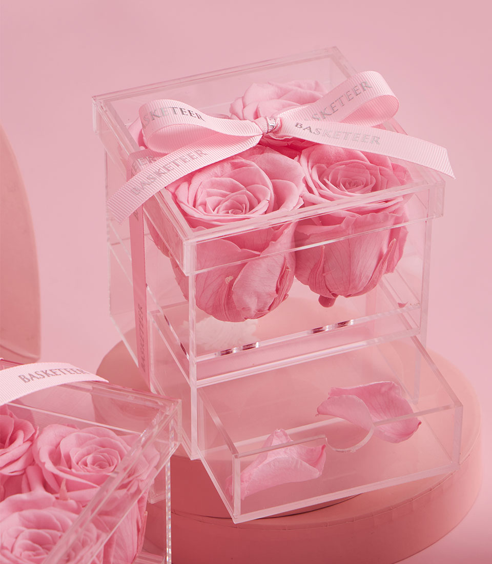 A luxury arrangement of premium preserved pink roses presented in a crystal-clear VIP acrylic box. These real, long-lasting roses symbolize grace and admiration, requiring no maintenance to stay beautiful for years. The elegant design includes a functional drawer, perfect for personalizing your gift with jewelry or chocolates. A timeless Valentine’s 2026 keepsake from Flowers by Basketeer.