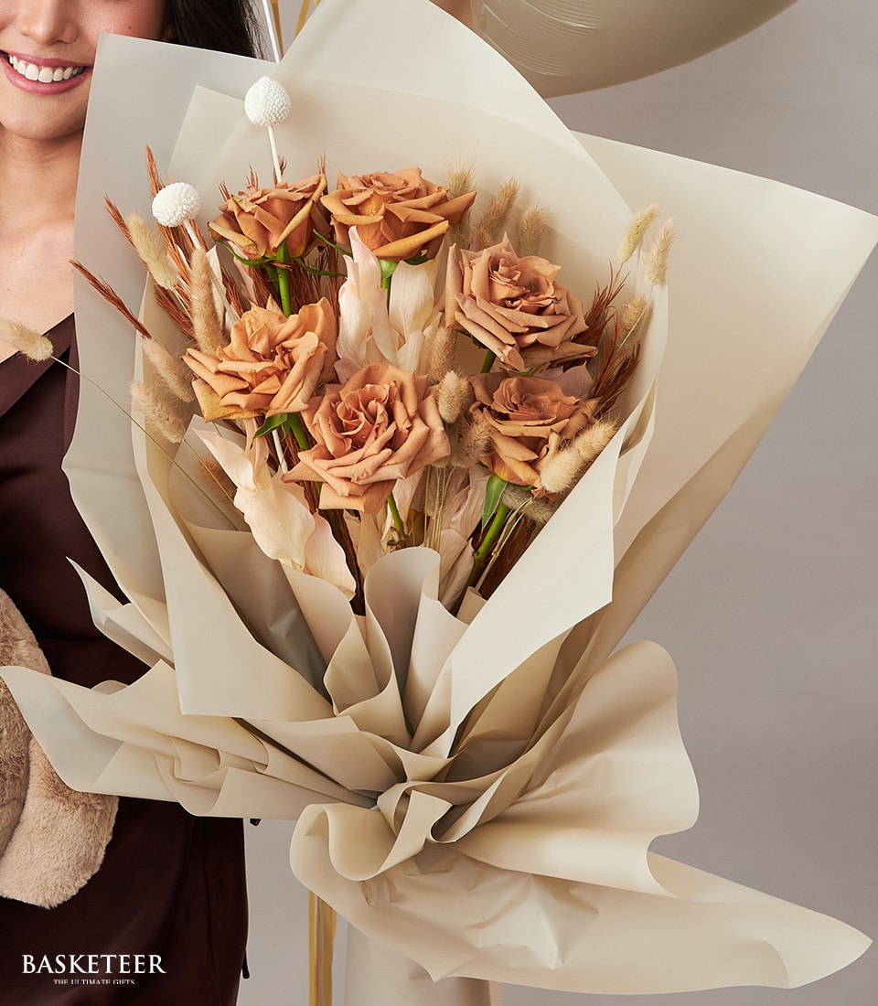 Charming Teddy & Balloons Gift Set Surprise your loved one with this luxurious floral & balloon duo, crafted to bring timeless beauty and sophisticated charm to any occasion. Featuring a lush bouquet of blush, peach, and soft pink roses, paired with a stunning set of bronze and nude heart balloons, this is the perfect way to say "You are cherished."