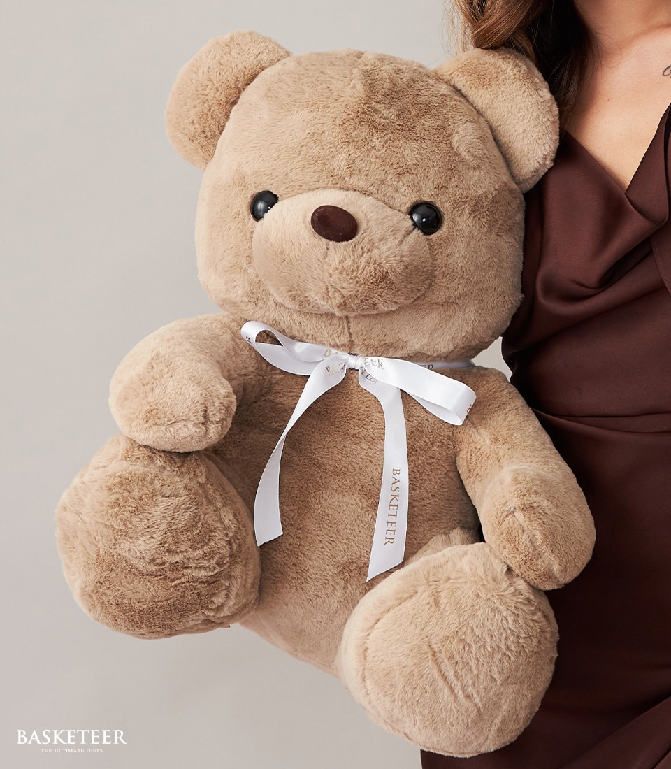 Surprise your loved one with a luxurious gift set: a plush teddy bear, warm-toned roses, and elegant gold & nude heart balloons for unforgettable moments.