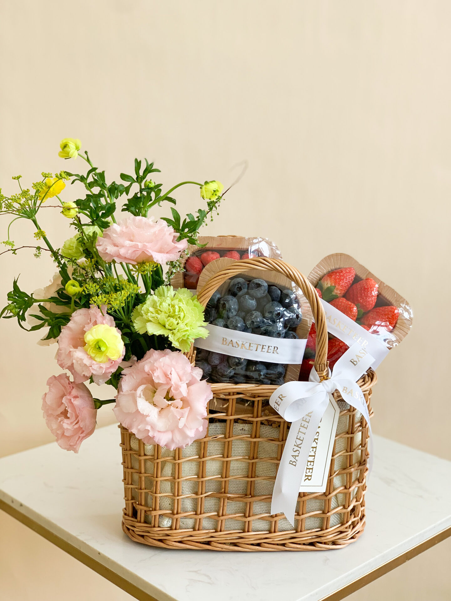 Fresh Fruit & Flower Basket This delightful basket features fresh strawberries, blueberries, and raspberries, paired with a beautiful arrangement of pastel flowers. A charming combination of sweetness and floral elegance, perfect for any celebration or as a thoughtful gift to brighten someone's day.