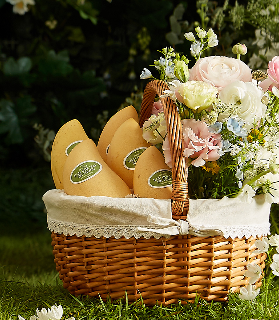 Delight in Nam Dok Mai See Thong Mangoes, elegantly presented in a vintage-inspired wicker basket with a stunning floral arrangement.