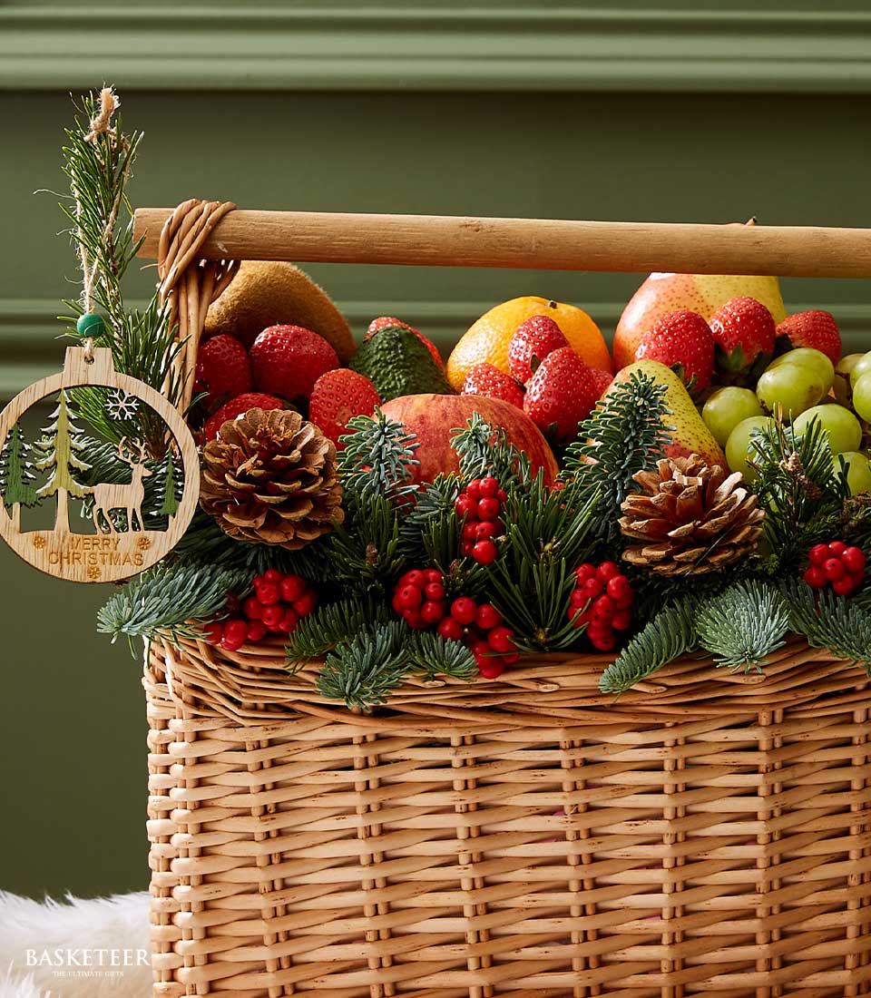 Holiday Fresh Fruit Gift Celebrate the festive season with the Christmas Delight Fruit Basket by Basketeer. This beautifully arranged basket is a perfect blend of fresh fruits and festive decorations, making it an ideal gift to spread holiday cheer and joy.