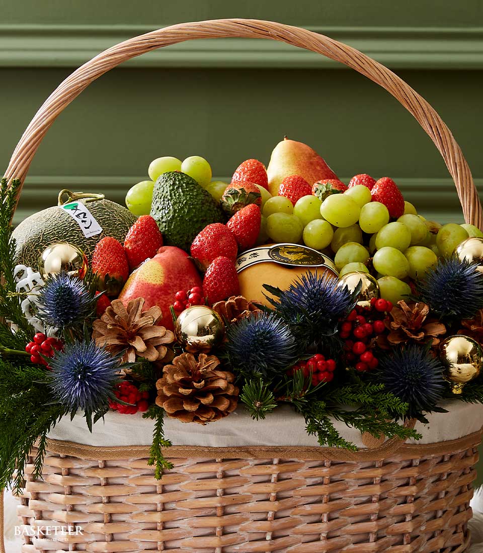 Elegant Holiday Fruit Basket Bring holiday cheer to your loved ones with the Festive Cheer Fruit Basket from Basketeer. This exquisite basket is a delightful combination of fresh fruits and festive decorations, perfect for celebrating the joyous season.
