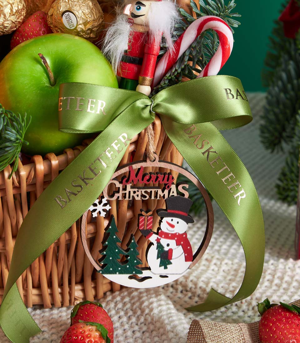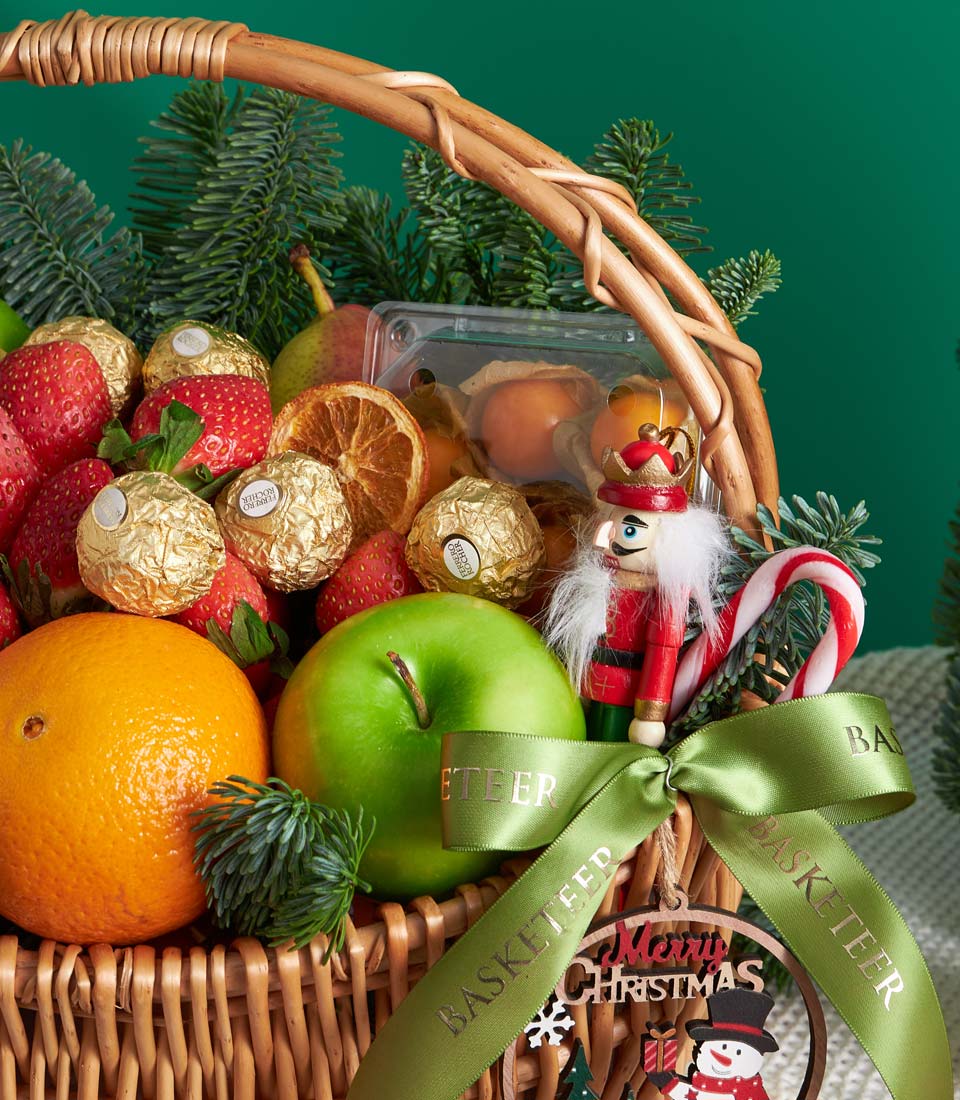 Luxury Imported Fruit Basket – Joyful Christmas Celebration Edition A charming Christmas fruit basket curated with a premium selection of imported fruits, beautifully arranged with festive ornaments and joyful holiday accents. Presented in a classic handwoven basket with Basketeer’s signature Christmas styling, this delightful gift brings warmth, happiness, and seasonal cheer.