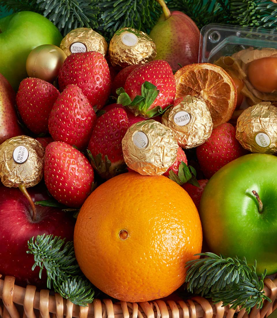 A festive Christmas fruit basket filled with premium imported fruits, Ferrero Rocher chocolate, and charming Christmas ornaments—beautifully arranged for joyful holiday gifting.