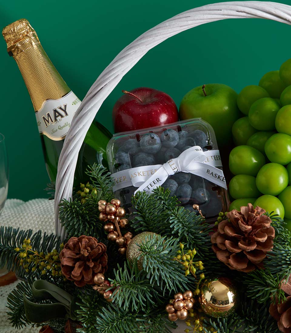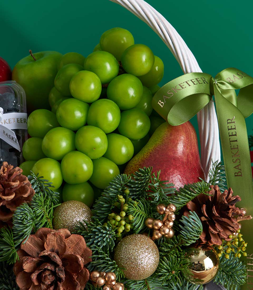 A festive Christmas fruit basket featuring premium imported fruits paired with white grape juice and holiday pine decorations.