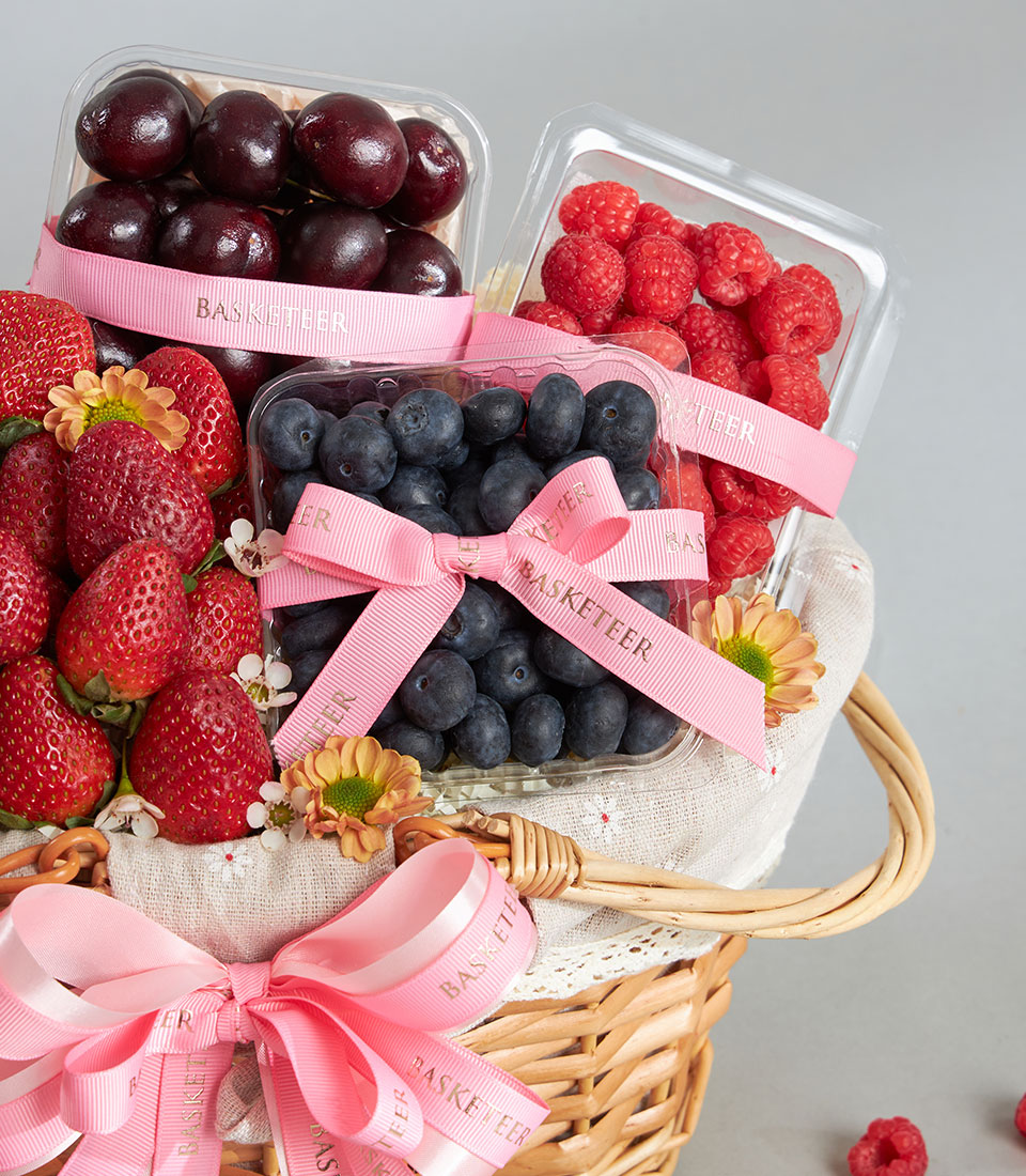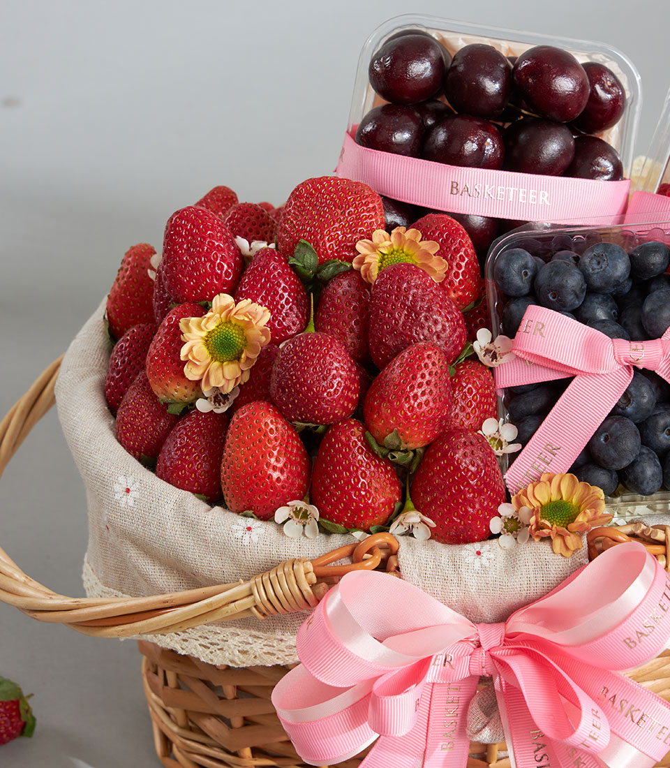 Premium Imported Berry Basket – Sweet Strawberry & Blueberry Delight A charming basket filled with premium imported cherries, blueberries, raspberries and strawberries from the USA, New Zealand, Australia, Chile and Peru. Carefully layered in a handwoven basket and tied with Basketeer’s pastel ribbon, this berry-forward gift is a delicious way to send love, vitamins and cheerful wishes.