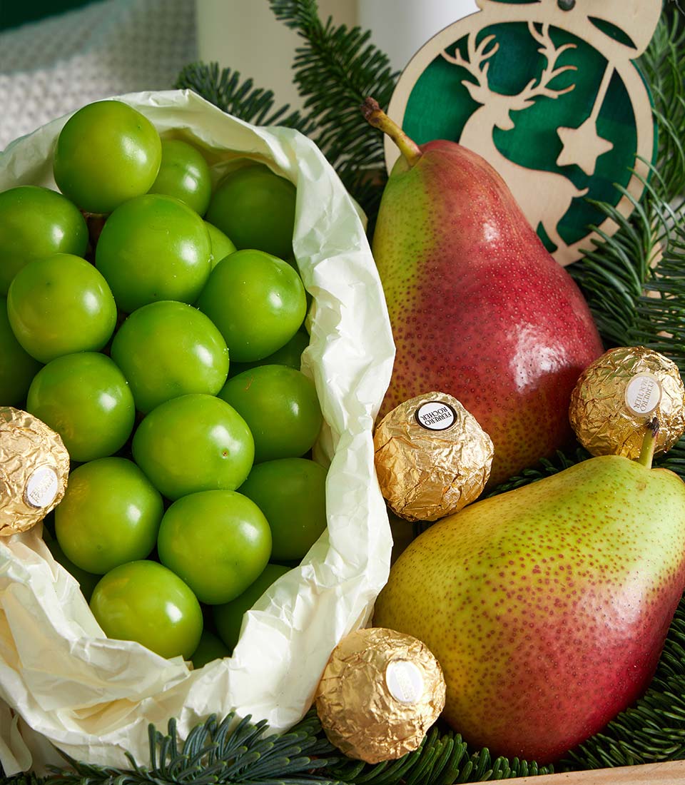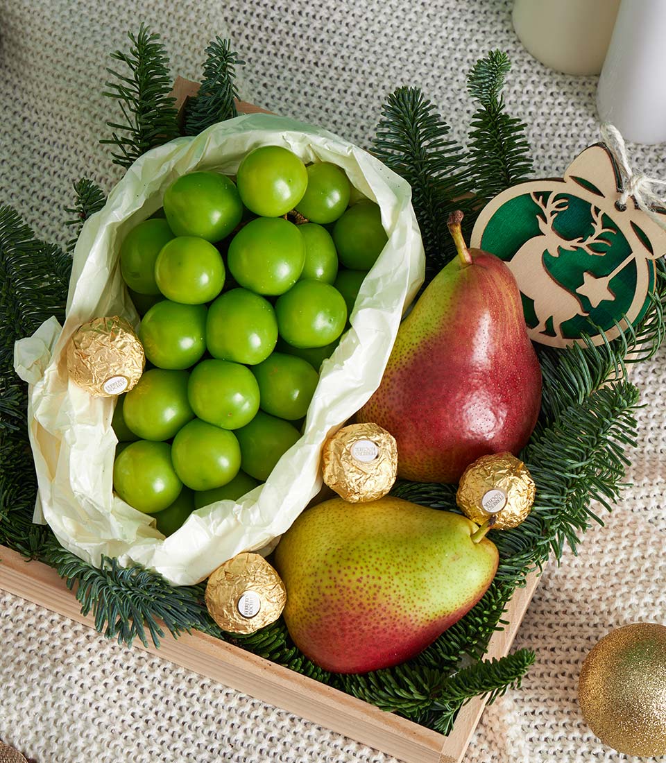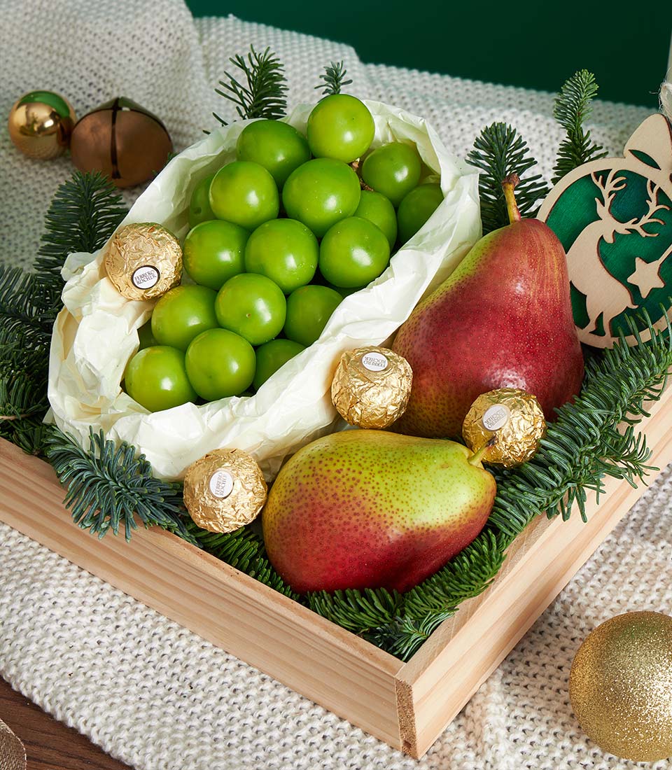 A charming festive fruit gift box featuring premium imported pears, Shine Muscat grapes, Ferrero Rocher chocolates, and Christmas-themed decorations — perfect for elegant seasonal gifting.