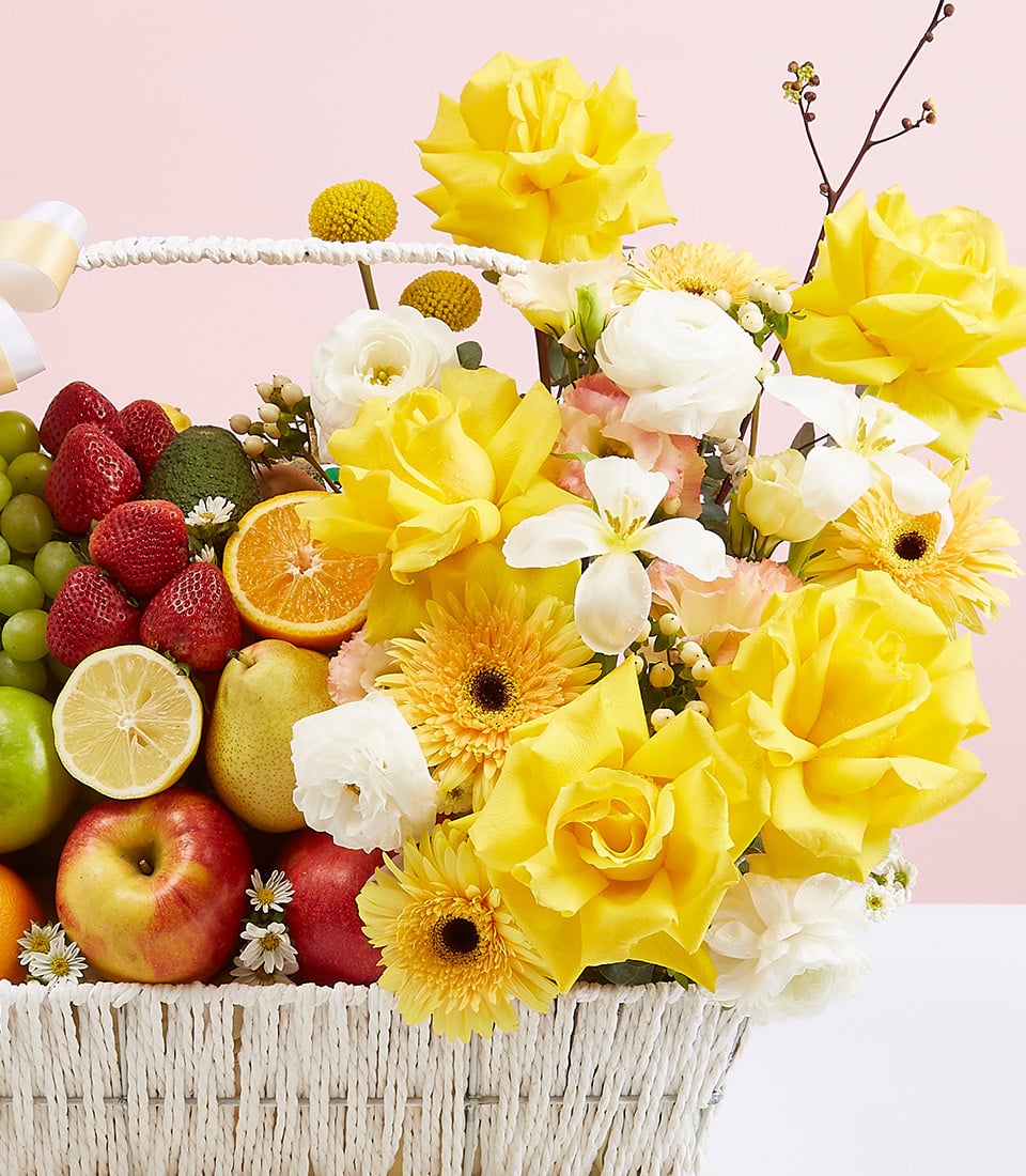 Fruit & Yellow Flower Basket Indulge in nature's finest offerings with our Fresh Fruits & Fresh Flowers Gift Basket. Perfect for all occasions!