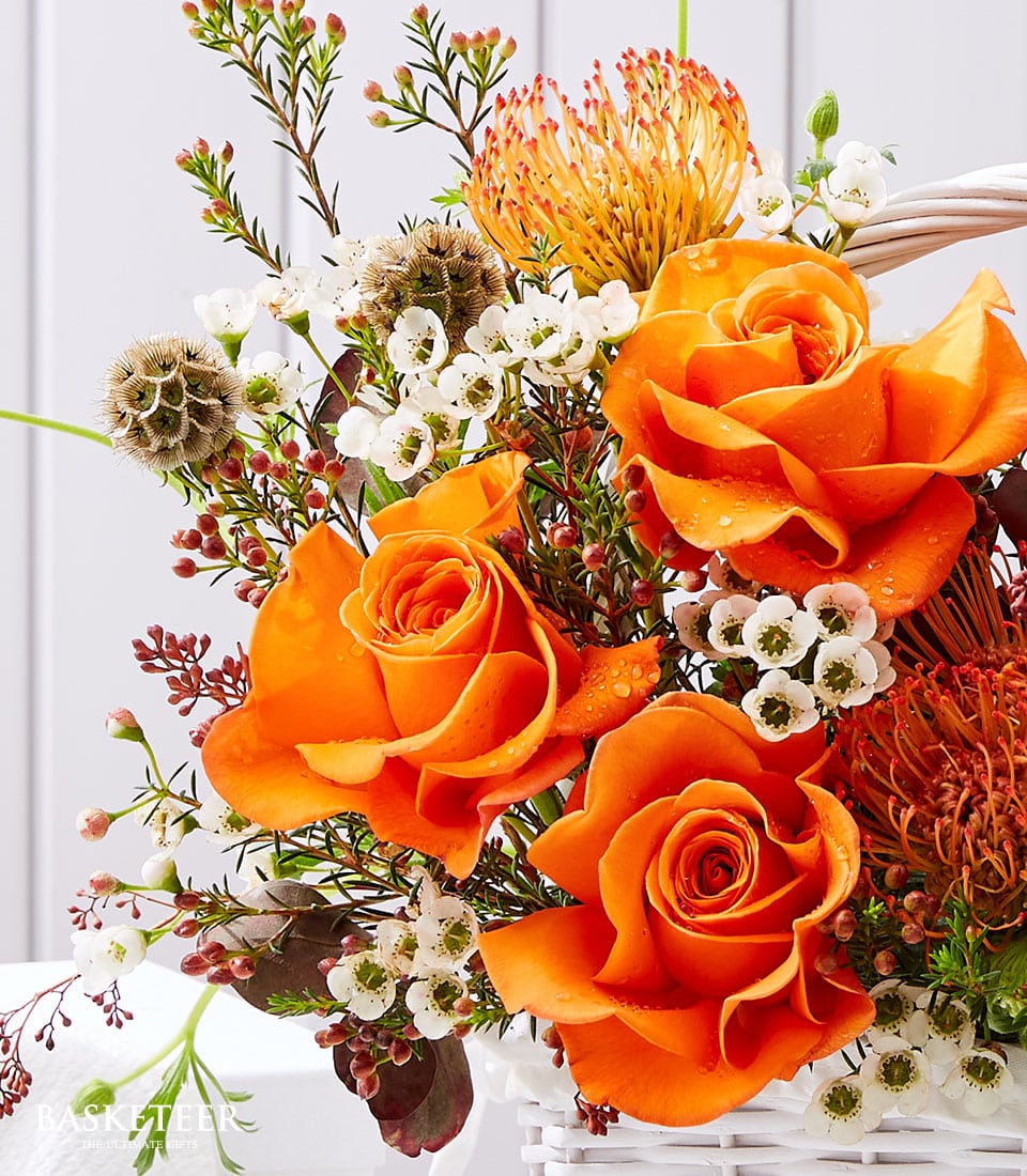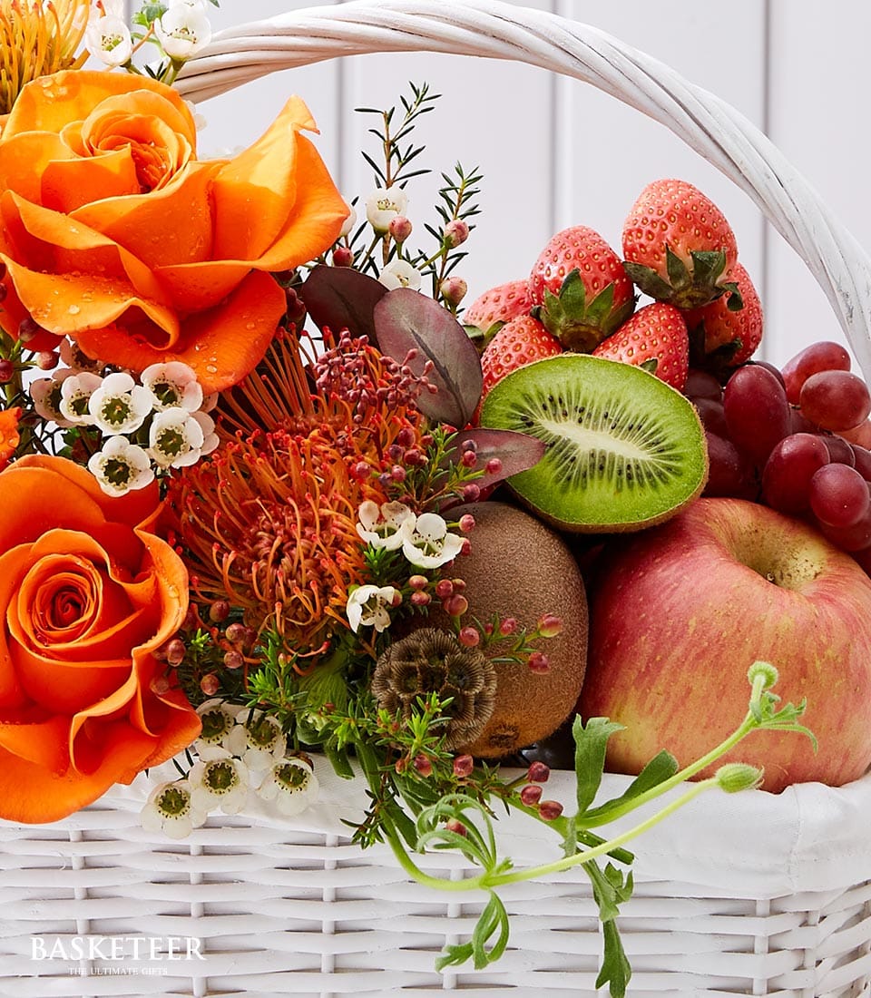 Fresh Fruit Orange Roses Embrace the vibrant hues of autumn with the Autumn Radiance Gift Basket by Basketeer. This exquisite arrangement pairs the freshest seasonal fruits with a stunning display of flowers, creating a delightful and eye-catching gift perfect for any occasion.