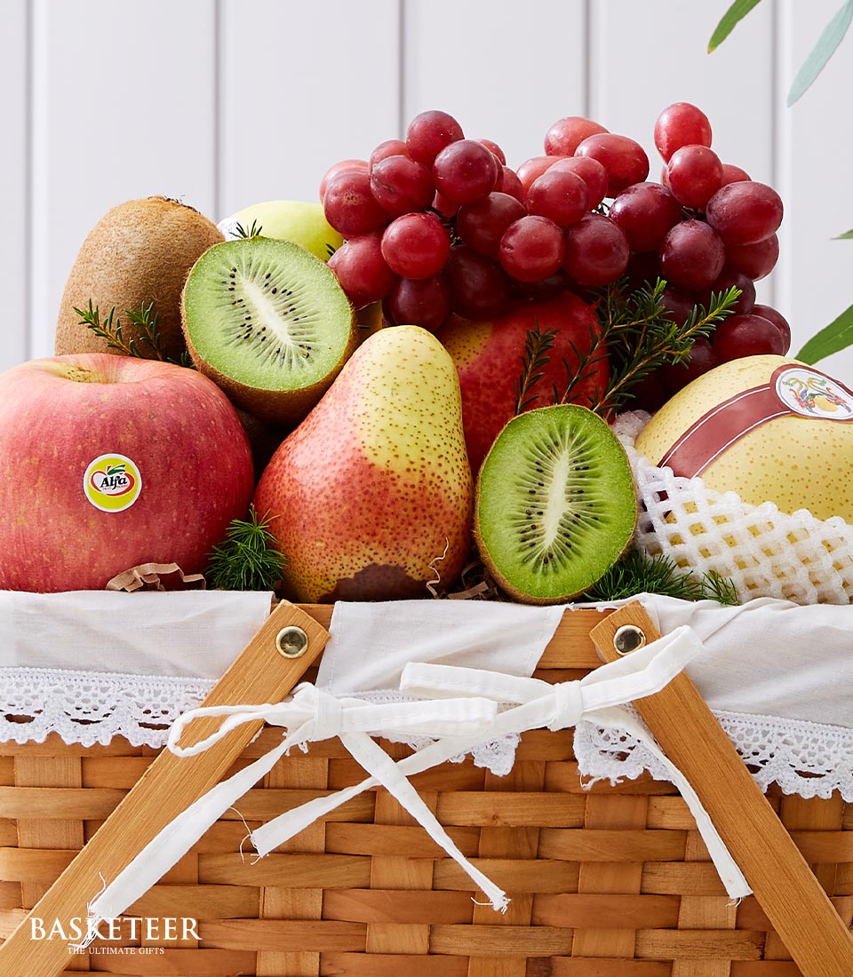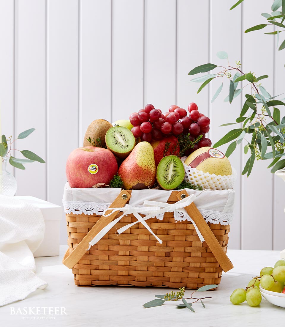 Deluxe Fruit Gift Basket Indulge in the natural sweetness and vibrant flavors of the Deluxe Fresh Fruit Basket. This carefully curated selection of premium fruits is presented in a charming wicker basket, lined with a delicate white cloth and adorned with rustic ties. Perfect for any special occasion, this basket is a delightful way to show you care.