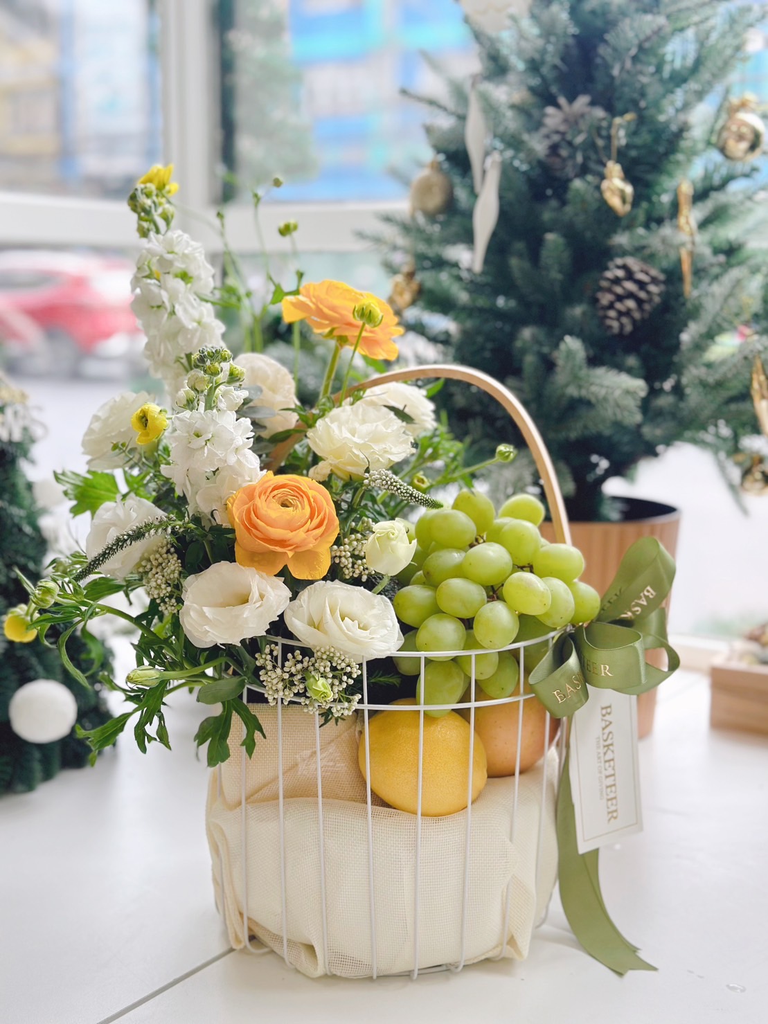 Bright wire fruit basket with green grapes, golden pear, and yellow flowers. A delightful gift for elegant and uplifting occasions.