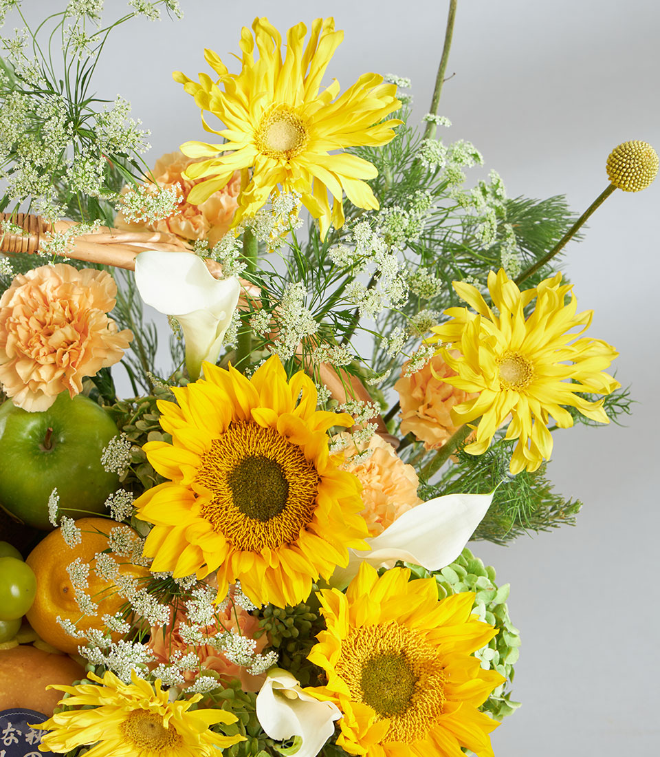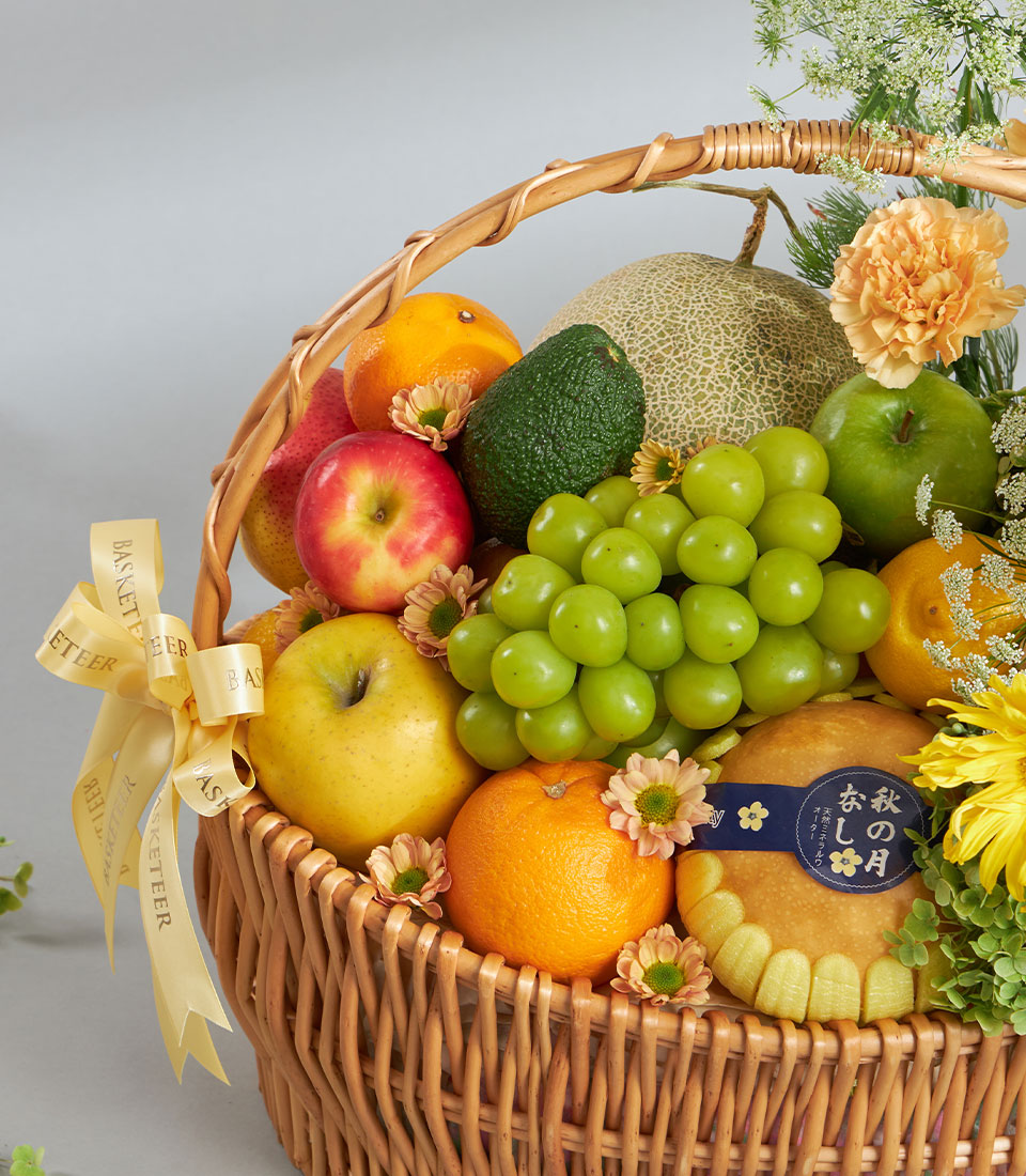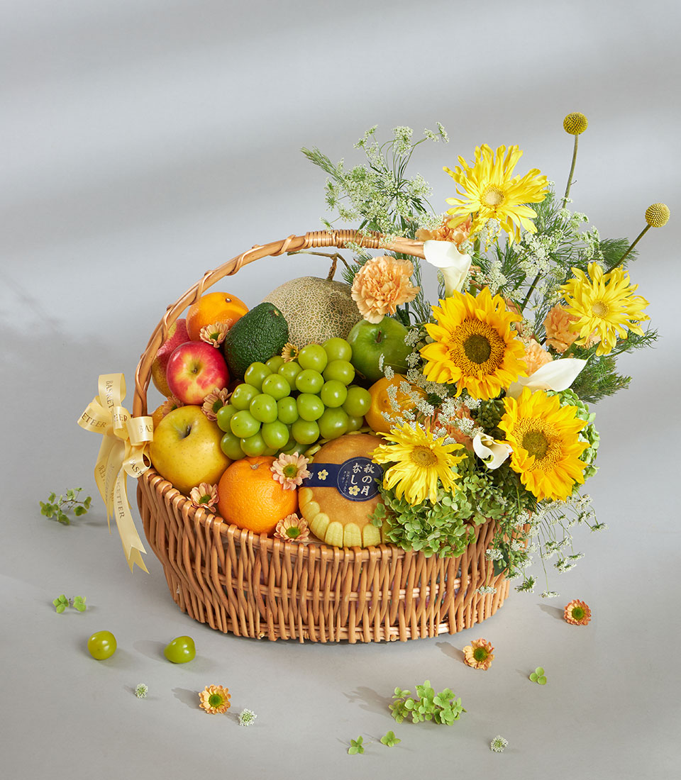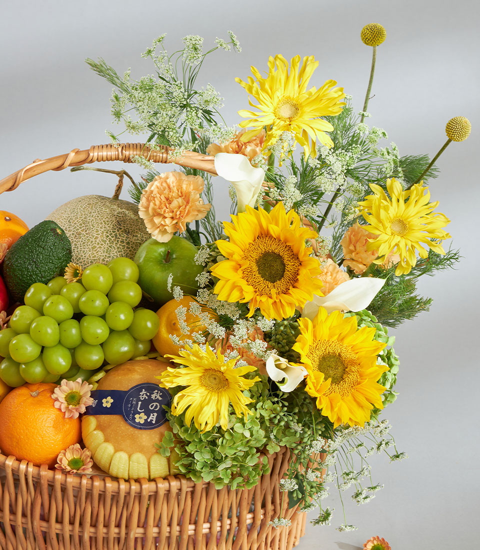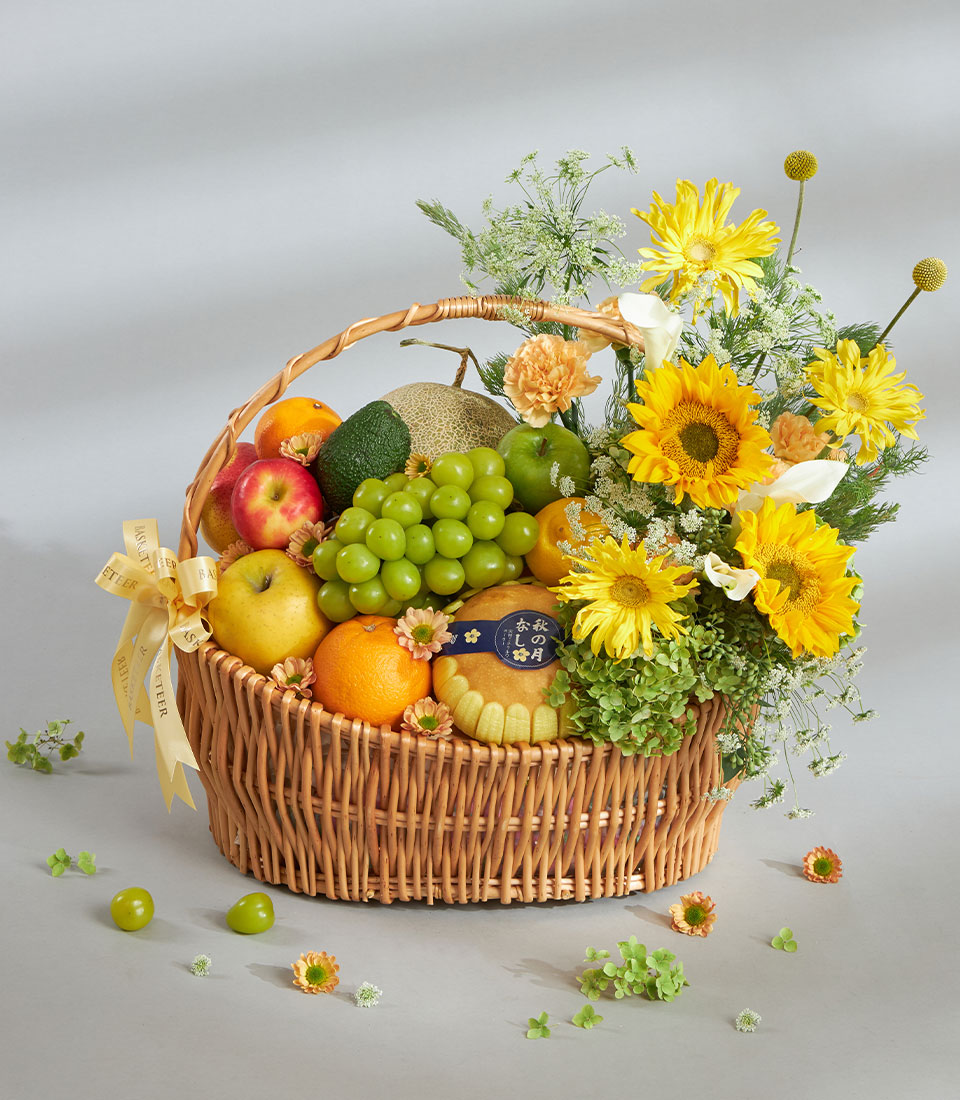 Sunshine Premium Imported Fruit & Flower Basket – Grand Celebration Edition A vibrant premium fruit and flower basket overflowing with a rich selection of imported apples, pears, citrus and Japanese fruits, complemented by bright yellow blooms and fresh greenery. Presented in a large handwoven basket with Basketeer’s signature ribbon, this design is ideal for grand, joy-filled celebrations.