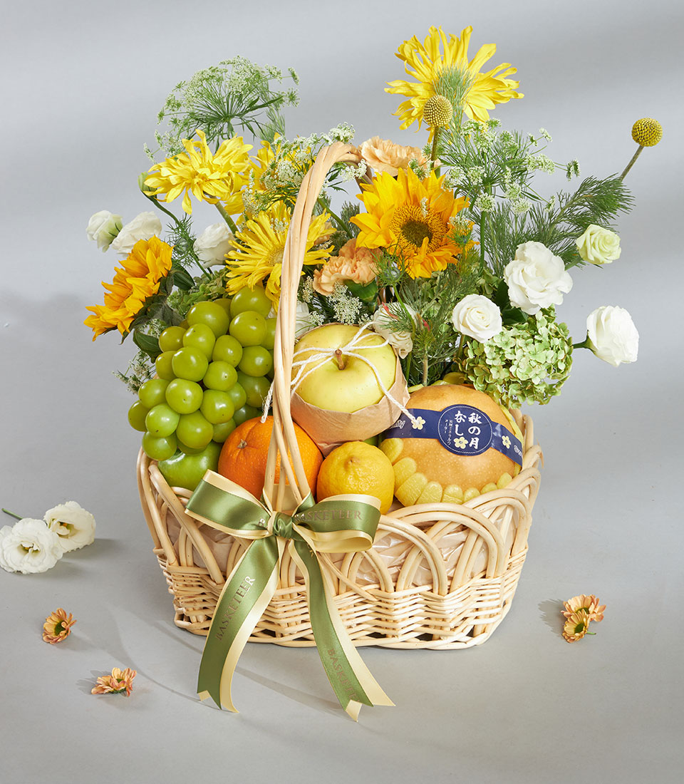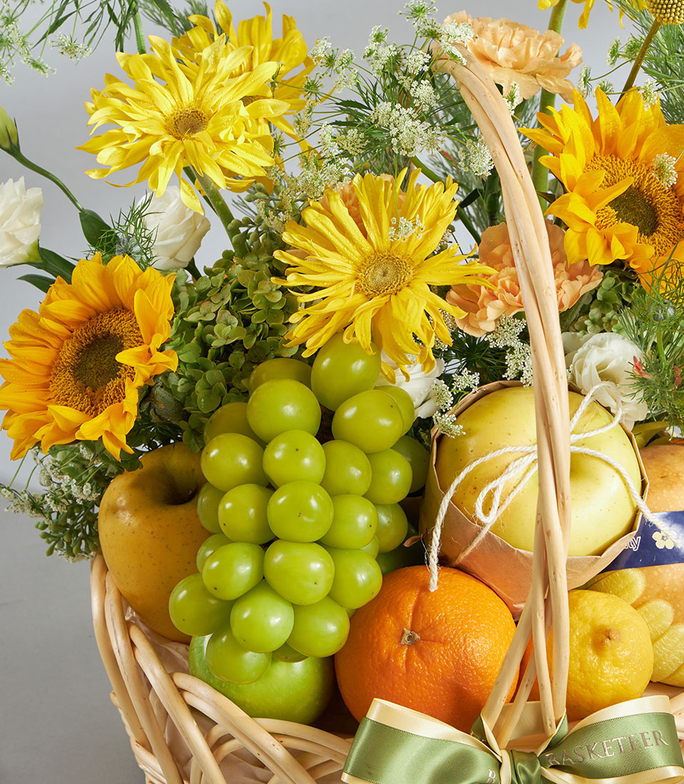 Luxury Imported Fruit & Flower Basket – Golden Sunshine Edition A joyful premium fruit and flower basket featuring a bright selection of imported fruits from New Zealand, USA, Korea, Japan, Spain and Australia, artfully arranged with fresh yellow-and-white blooms. Presented in a woven basket with Basketeer’s signature green ribbon, this radiant gift brings warmth, vitality and heartfelt well wishes.