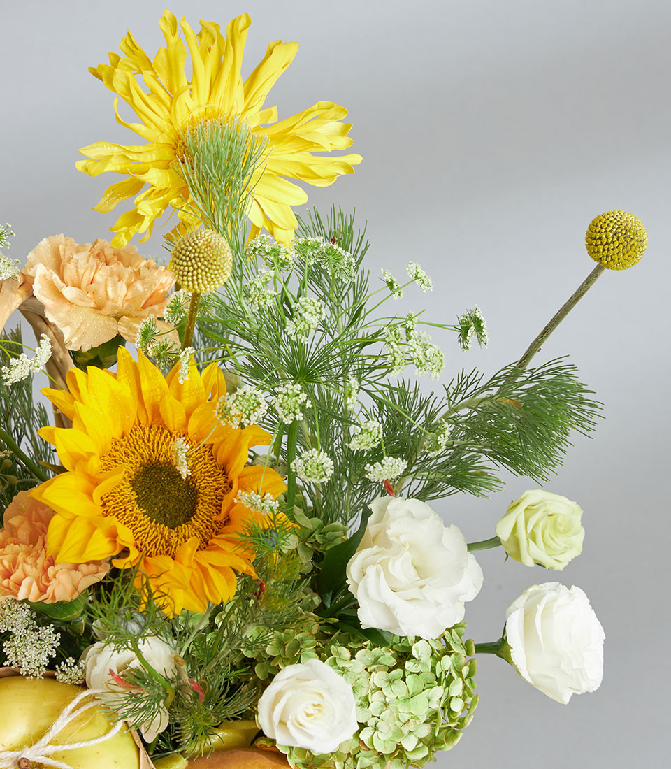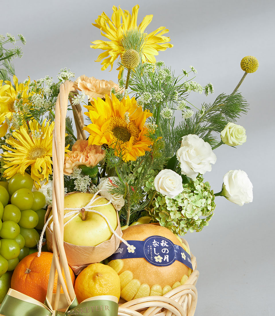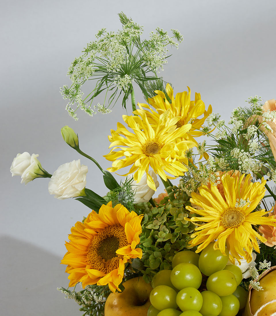 A bright and cheerful premium fruit and floral basket featuring Shine Muscat grapes, Toki apples, Granny Smith apples, Korean pear, lemon, and Sunkist orange. Paired with a vibrant yellow-and-white floral arrangement of sunflowers, mums, lisianthus, and seasonal greens, this uplifting gift conveys joy, encouragement, and heartfelt well-wishes. Perfect for celebrations, appreciation, recovery gifts, and meaningful moments with same-day delivery in Bangkok.