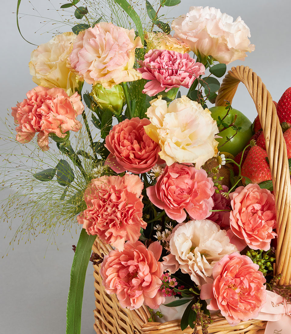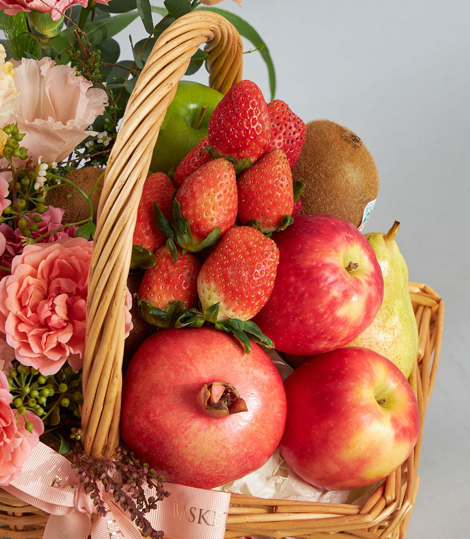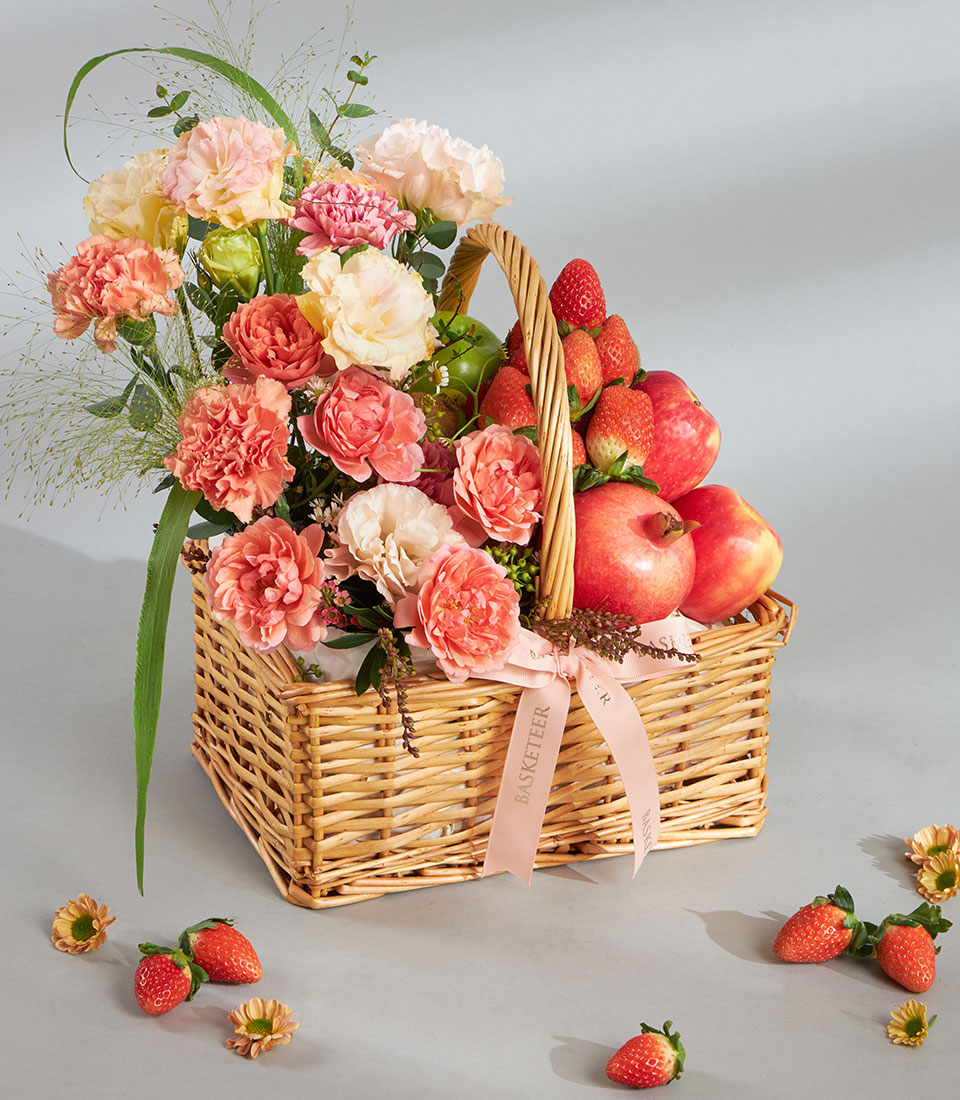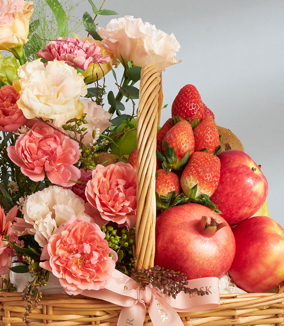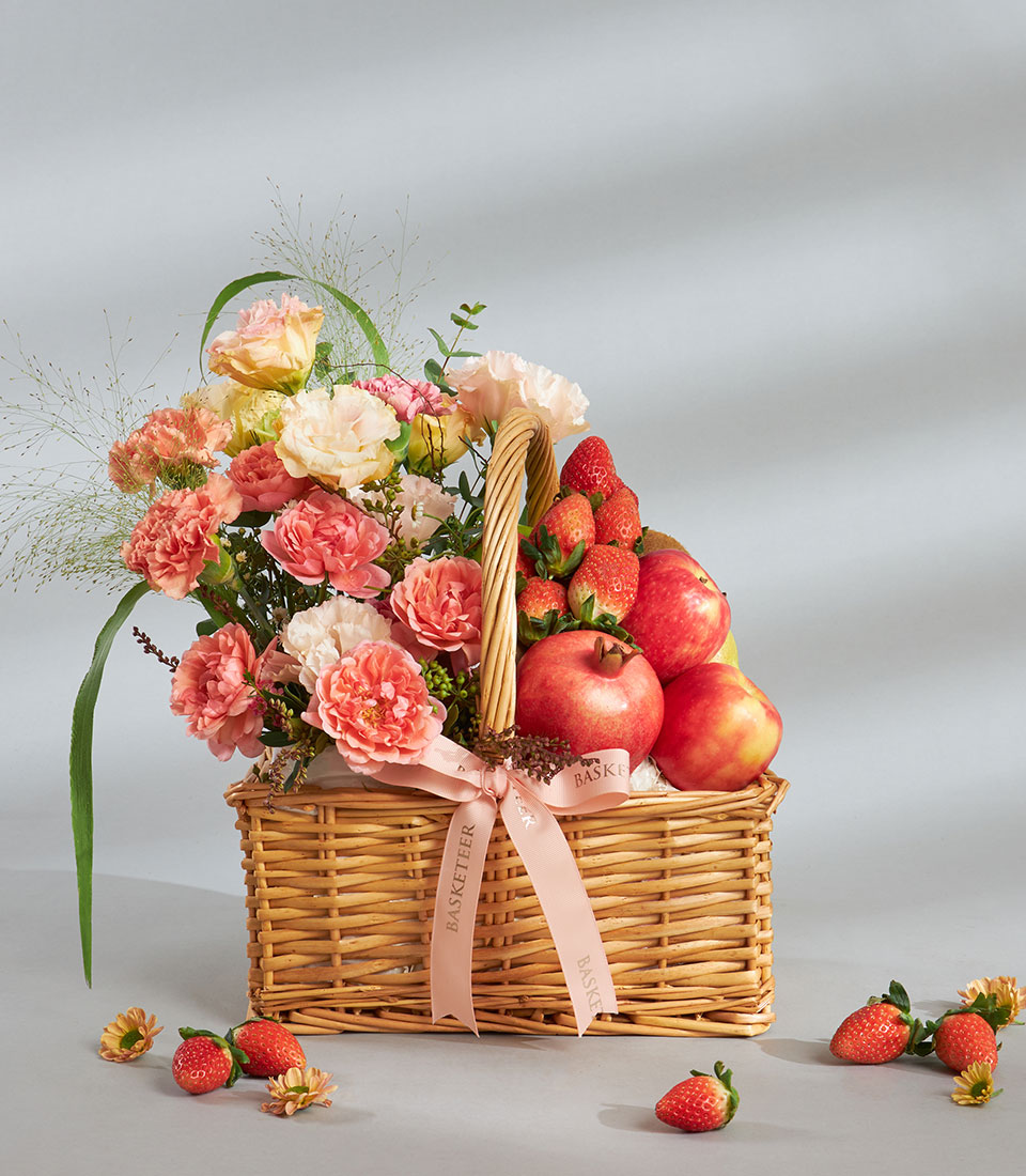 Premium Imported Fruit & Flower Basket – Blush Coral Garden Edition An elegant premium fruit and flower basket showcasing a curated mix of imported fruits from New Zealand, Australia, Chile, India and Spain, paired with romantic coral-toned blooms. Arranged in a charming wicker basket with Basketeer’s signature ribbon, this graceful creation is perfect for sending warm wishes with a touch of luxury.