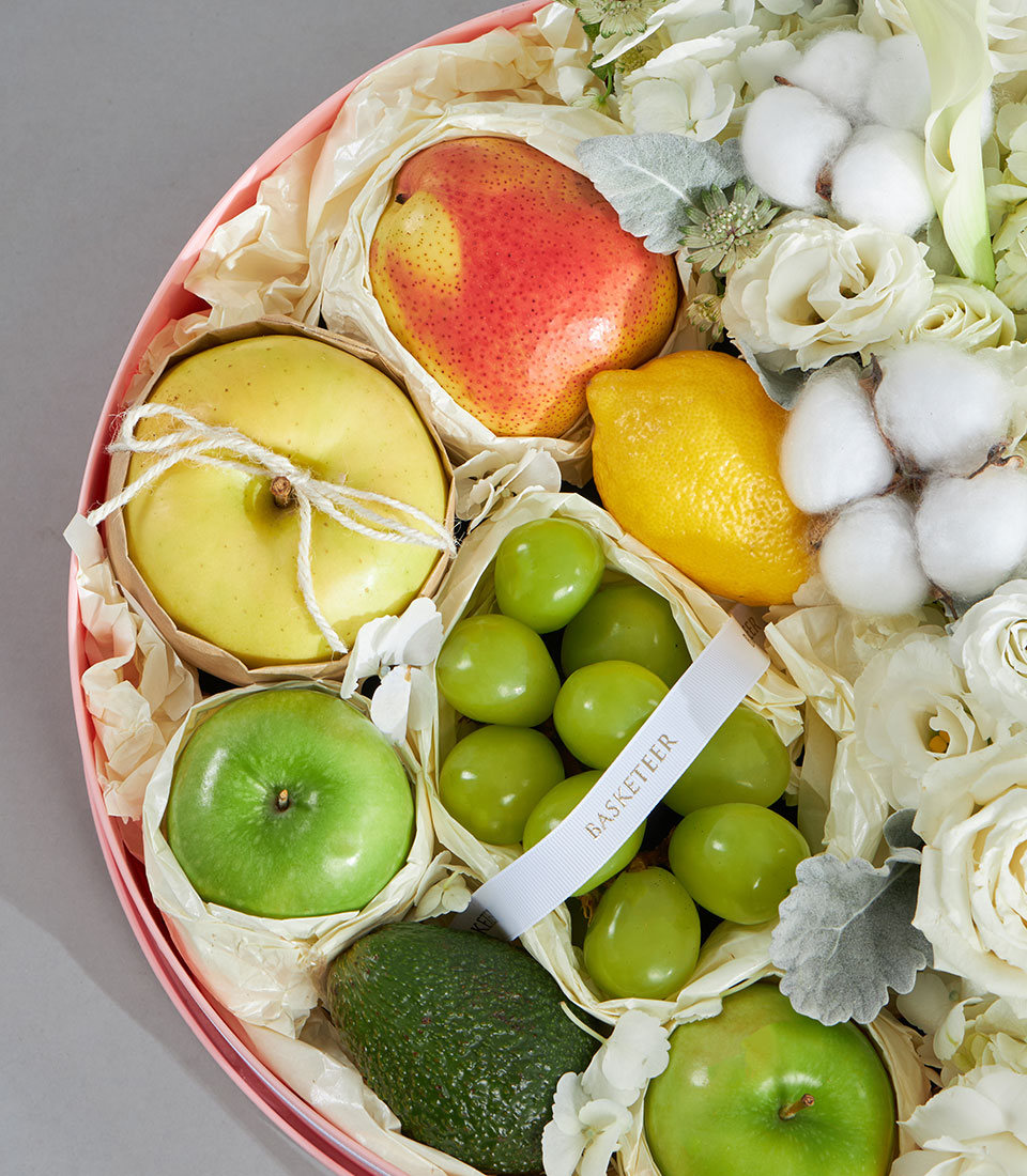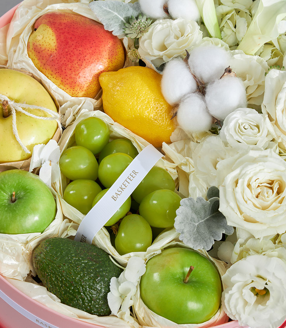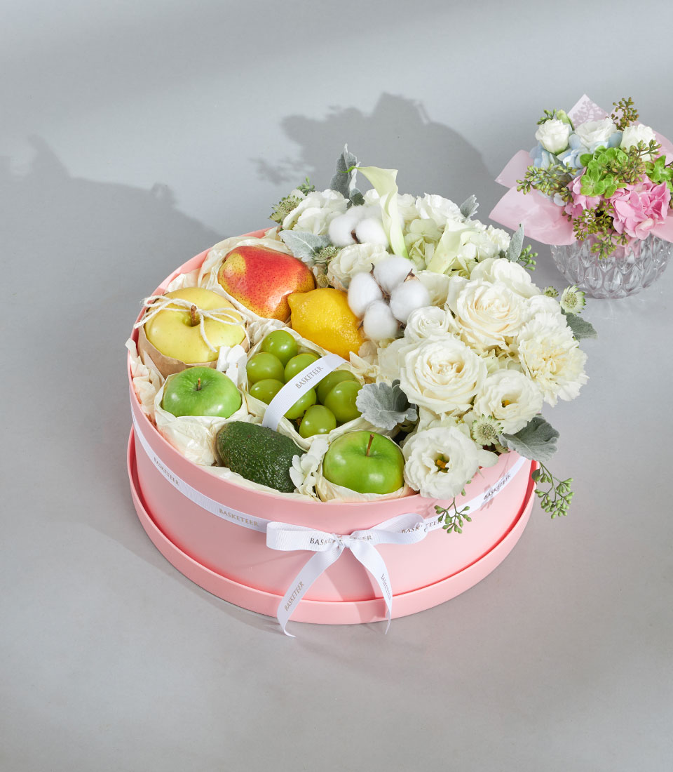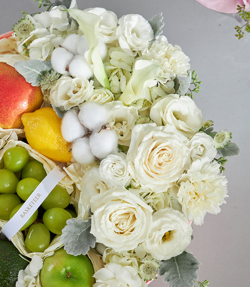 Premium Imported Fruit & Flower Round Box – Ivory Garden Edition An elegant premium round fruit and flower box in soft ivory and white tones, highlighting imported fruits nestled amongst fluffy white blooms. Presented in a blush round box with Basketeer’s ribbon, this refined design is perfect for sending pure, graceful well wishes.